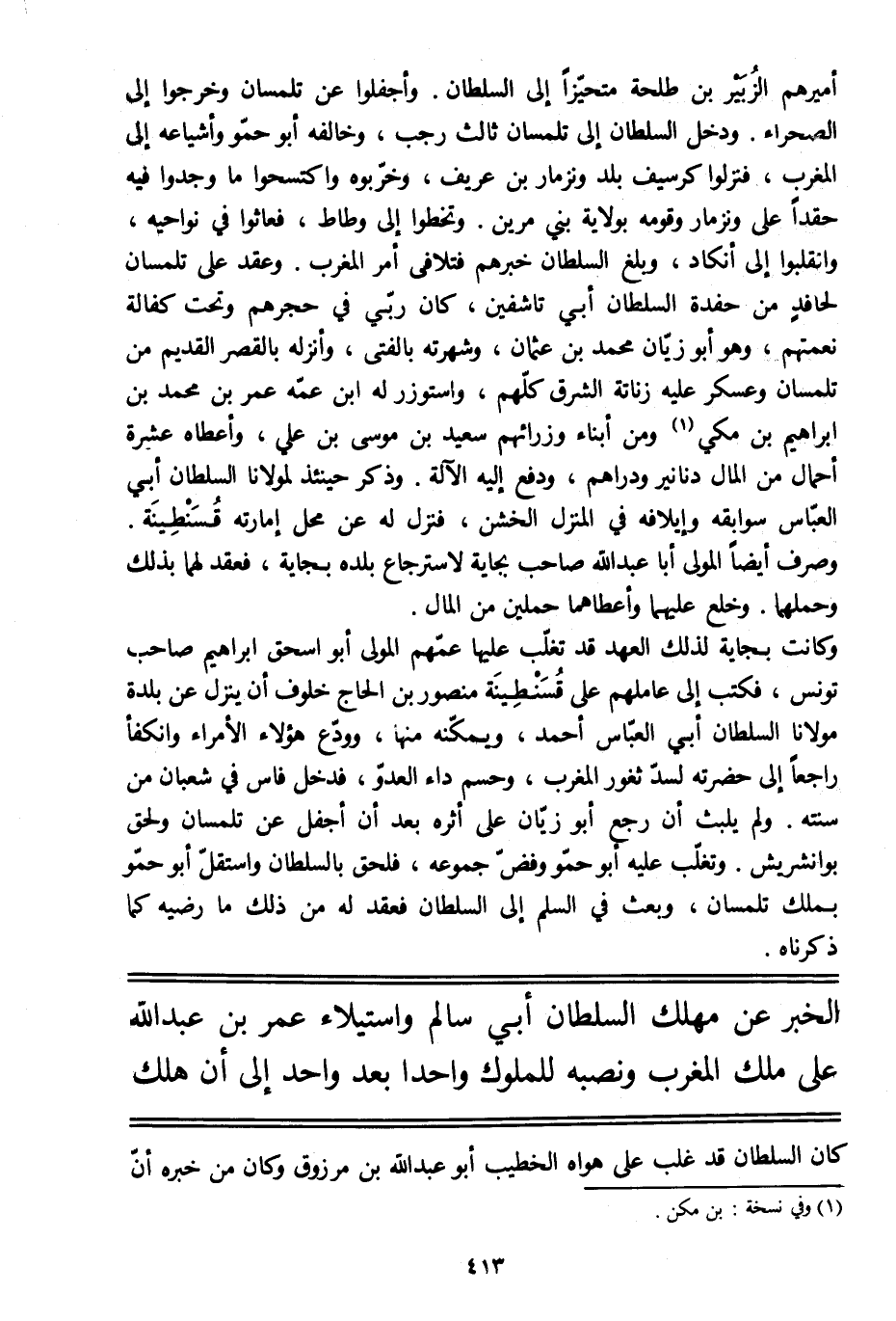 أميرهم الزبير بن طلحة متحيّزا إلى السلطان. وأجفلوا عن تلمسان وخرجوا إلى الصحراء. ودخل السلطان إلى تلمسان ثالث رجب، وخالفه أبو حمّو وأشياعه إلى المغرب، فنزلوا كرسيف بلد ونزمار بن عريف، وخرّبوه واكتسحوا ما وجدوا فيه حقدا على ونزمار وقومه بولاية بني مرين. وتخطوا إلى وطاط، فعاثوا في نواحيه، وانقلبوا إلى أنكاد، وبلغ السلطان خبرهم فتلافى أمر المغرب. وعقد على تلمسان لحافد من حفدة السلطان أبي تاشفين، كان ربّي في حجرهم وتحت كفالة نعمتهم، وهو أبو زيّان محمد بن عثمان، وشهرته بالفتى، وأنزله بالقصر القديم من تلمسان وعسكر عليه زناتة الشرق كلّهم، واستوزر له ابن عمّه عمر بن محمد بن إبراهيم بن مكي [1] ومن أبناء وزرائهم سعيد بن موسى بن علي، وأعطاه عشرة أحمال من المال دنانير ودراهم، ودفع إليه الآلة. وذكر حينئذ لمولانا السلطان أبي العبّاس سوابقه وإيلافه في المنزل الخشن، فنزل له عن محل إمارته قسنطينة.