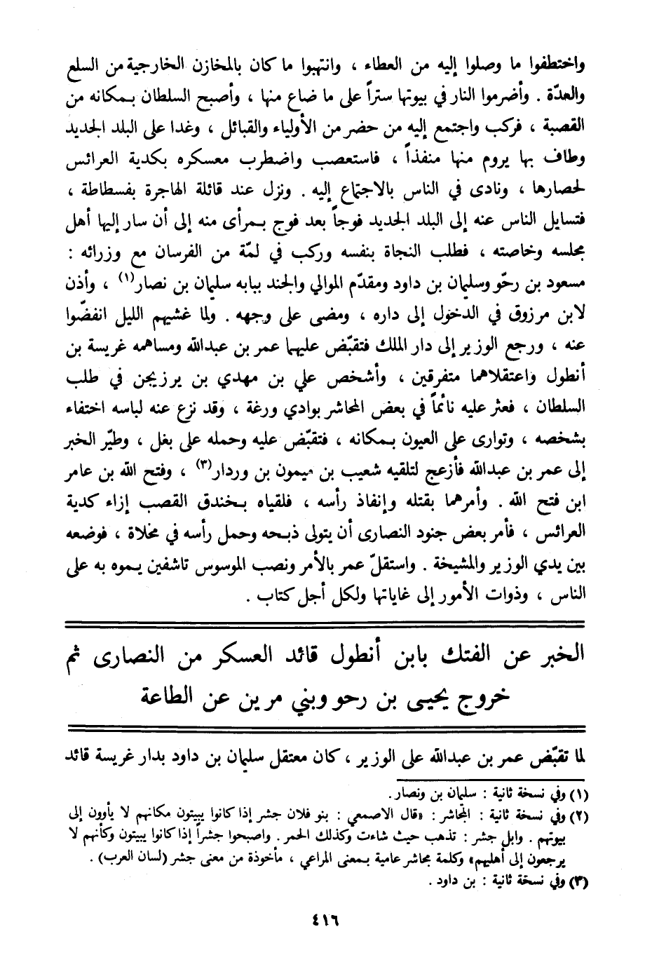 الخبر عن الفتك بابن أنطول قائد العسكر من النصارى ثم خروج يحيى بن رحو وبني مرين عن الطاعة