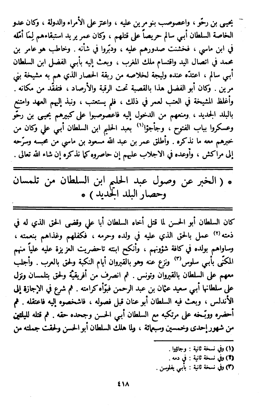 كان السلطان أبو الحسن لما قتل أخاه السلطان أبا علي وقضى الحق الّذي له في ذمته [2] عمل بالحق الّذي عليه في ولده وحرمه، فكفلهم وغذاهم بنعمته، وساواهم بولده في كافة شئونهم، وأنكح ابنته تاحضريت العزيزة عليه عليا منهم المكنّى بأبي سلوس [3] ونزع عنه وهو بالقيروان أيام النكبة ولحق بالعرب. وأجلب معهم على السلطان بالقيروان وتونس. ثم انصرف من إفريقية ولحق بتلمسان ونزل على سلطانها أبي سعيد عثمان بن عبد الرحمن فبوّأه كرامته. ثم شرع في الإجازة إلى الأندلس، وبعث فيه السلطان أبو عنان قبل فصوله، فاشخصوه إليه فاعتقله. ثم أحضره ووبّخه على مرتكبه مع السلطان أبي الحسن وجحده حقه. ثم قتله لليلتين من شهور إحدى وخمسين وسبعمائة، ولما هلك السلطان أبو الحسن ولحقت جملته من