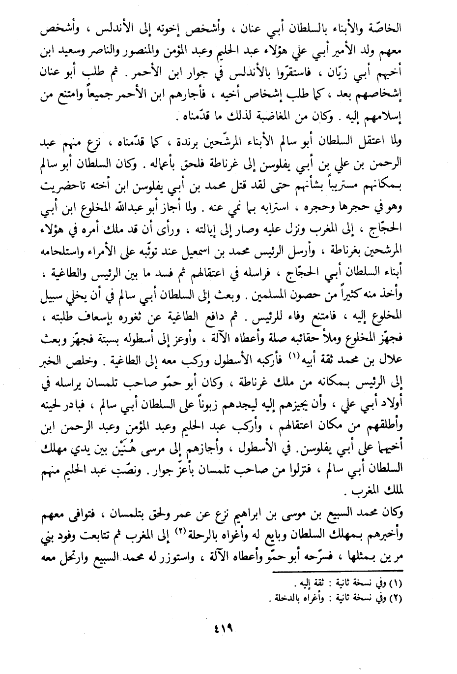 الخاصّة والأبناء بالسلطان أبي عنان، وأشخص إخوته إلى الأندلس، وأشخص معهم ولد الأمير أبي علي هؤلاء عبد الحليم وعبد المؤمن والمنصور والناصر وسعيد ابن أخيهم أبي زيّان، فاستقرّوا بالأندلس في جوار ابن الأحمر. ثم طلب أبو عنان إشخاصهم بعد، كما طلب إشخاص أخيه، فأجارهم ابن الأحمر جميعا وامتنع من إسلامهم إليه. وكان من المغاضبة لذلك ما قدّمناه.