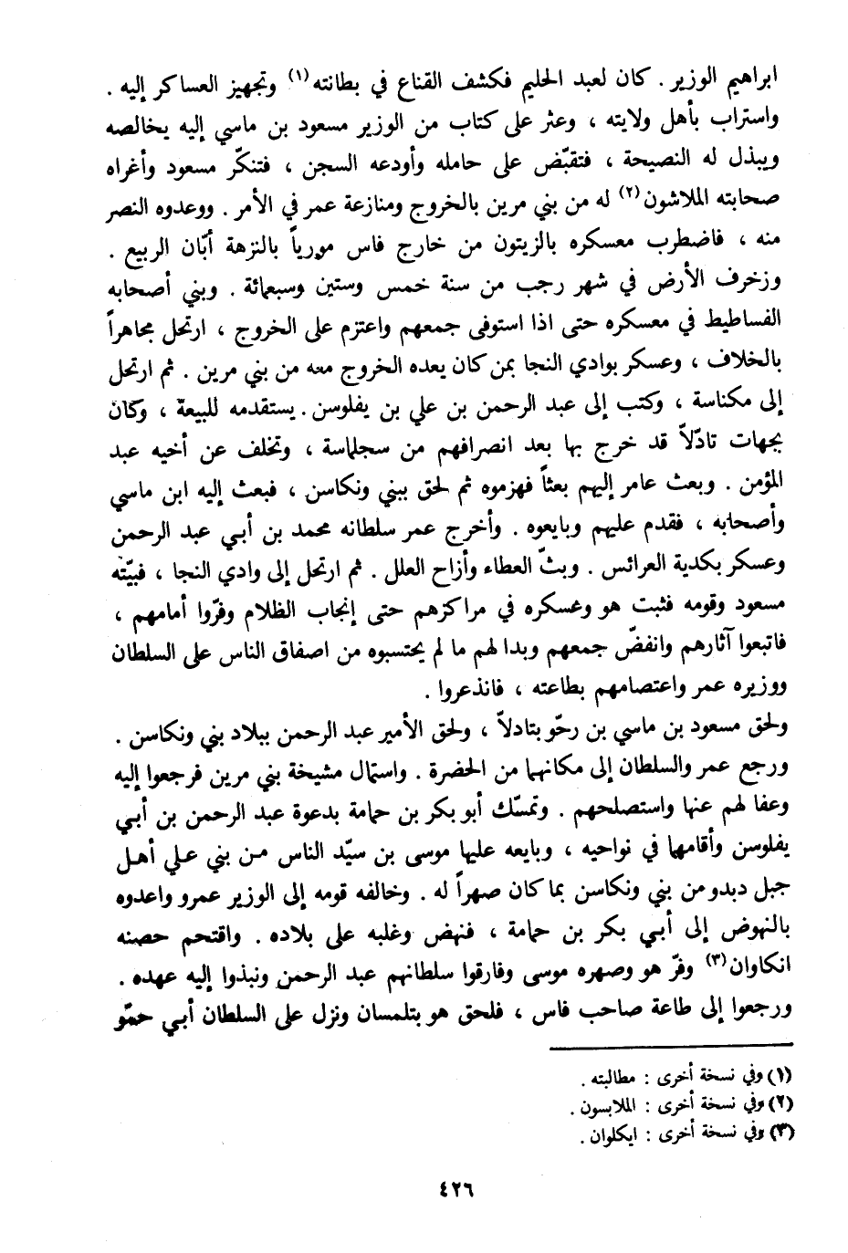 ورجع عمر والسلطان إلى مكانهما من الحضرة. واستمال مشيخة بني مرين فرجعوا إليه وعفا لهم عنها واستصلحهم. وتمسّك أبو بكر بن حمامة بدعوة عبد الرحمن بن أبي يفلوسن وأقامهما في نواحيه، وبايعه عليها موسى بن سيّد الناس من بني علي أهل جبل دبدو من بني ونكاسن بما كان صهرا له. وخالفه قومه إلى الوزير عمر وواعدوه بالنهوض إلى أبي بكر بن حمامة، فنهض وغلبه على بلاده. واقتحم حصنه انكاوان [3] وفرّ هو وصهره موسى وفارقوا سلطانهم عبد الرحمن ونبذوا إليه عهده.