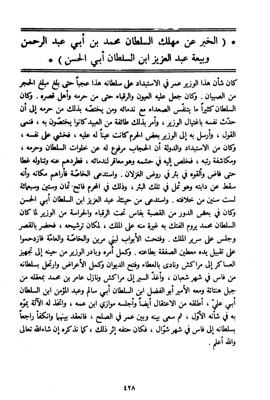 (الخبر عن مهلك السلطان محمد بن أبي عبد الرحمن وبيعة عبد العزيز ابن السلطان أبي الحسن)