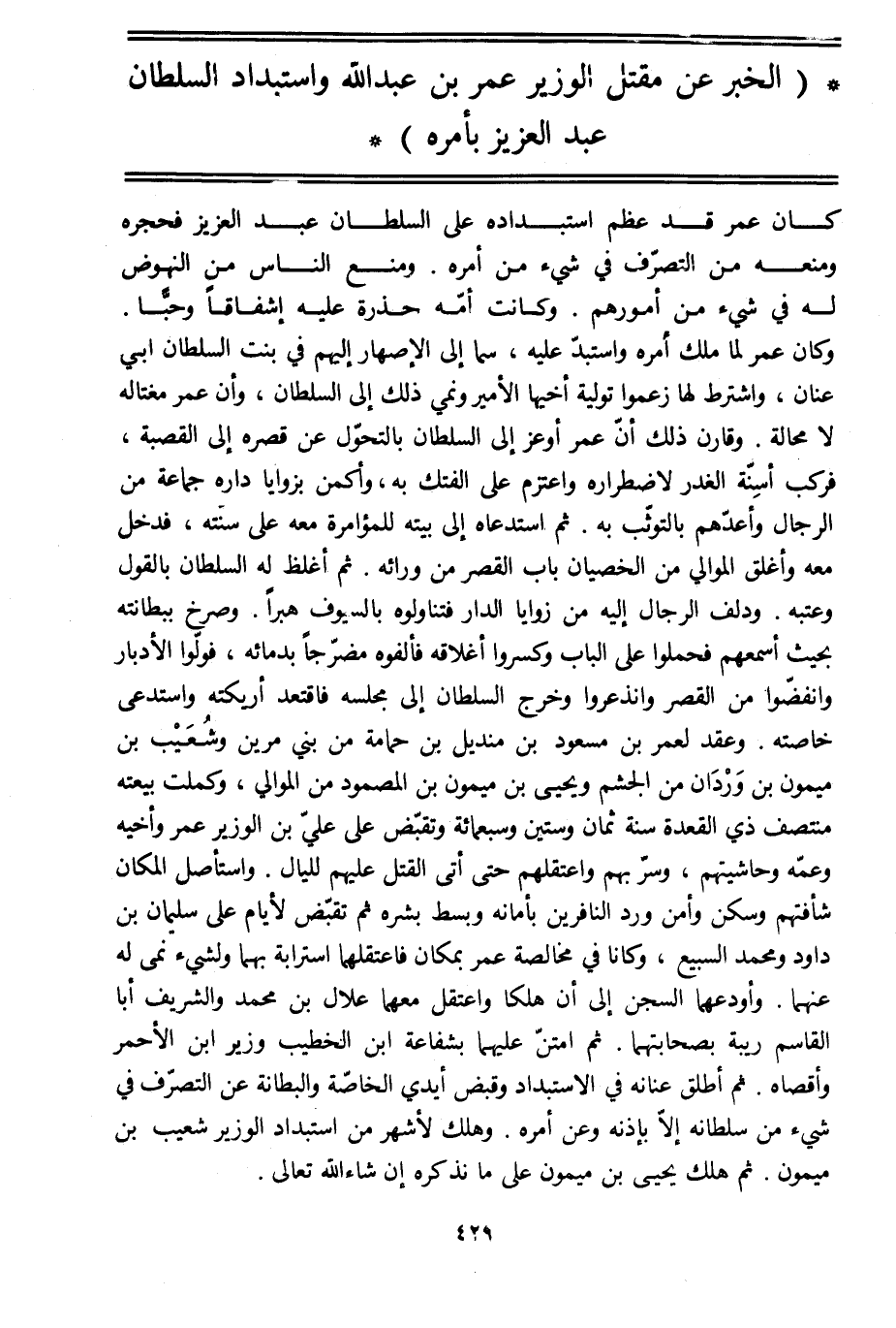 (الخبر عن مقتل الوزير عمر بن عبد الله واستبداد السلطان عبد العزيز بأمره)