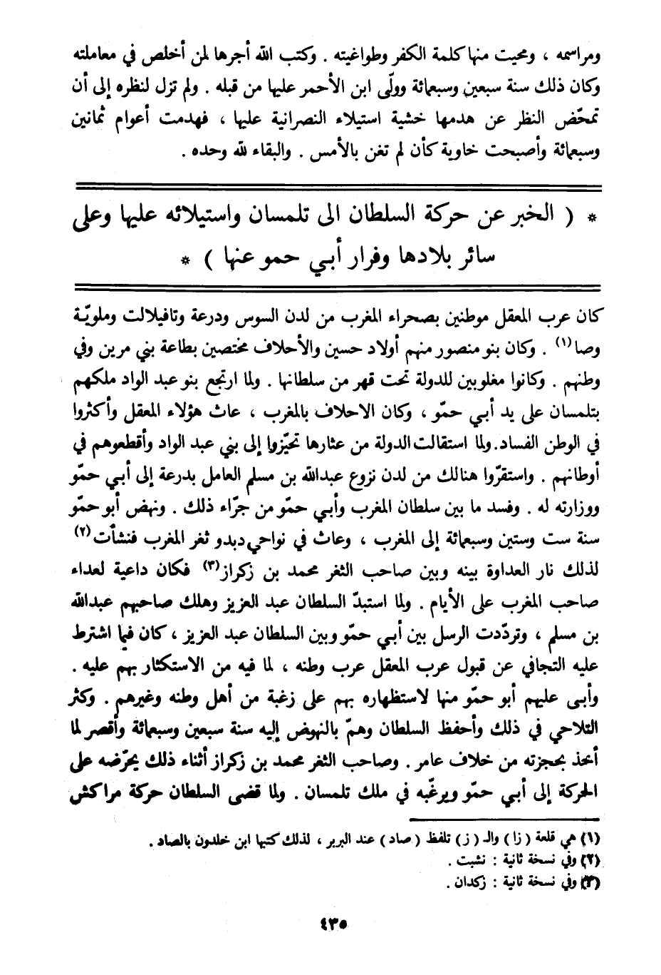 وأبي عليهم أبو حمّو منها لاستظهاره بهم على زغبة من أهل وطنه وغيرهم. وكثر التلاحي في ذلك وأحفظ السلطان وهمّ بالنهوض إليه سنة سبعين وسبعمائة وأقصر لما أخذ بحجزته من خلاف عامر. وصاحب الثغر محمد بن زكراز أثناء ذلك يحرّضه على الحركة إلى أبي حمّو ويرغّبه في ملك تلمسان. ولما قضى السلطان حركة مراكش