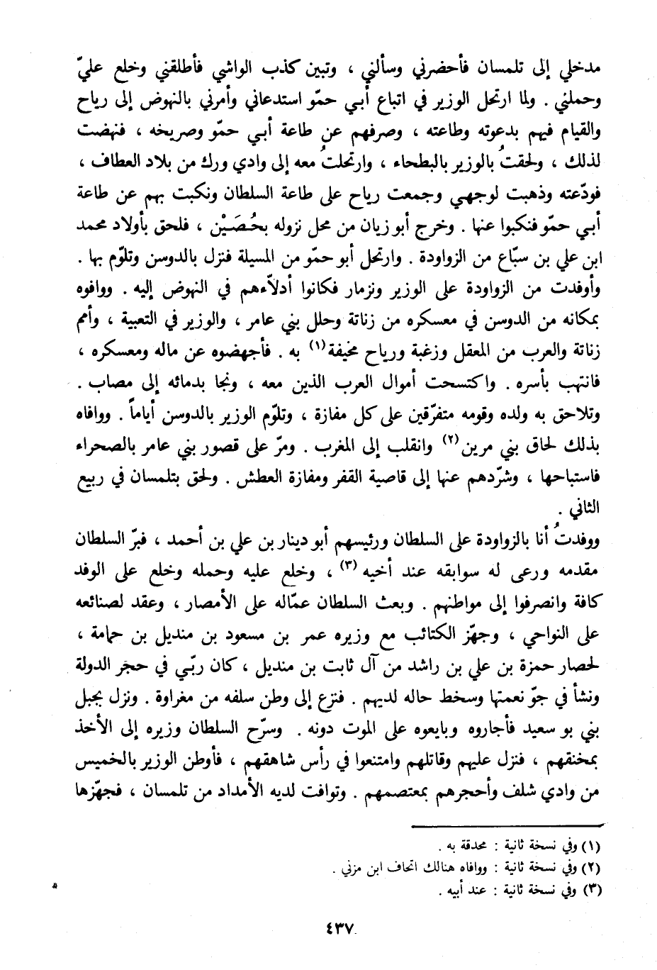 مدخلي إلى تلمسان فأحضرني وسألني، وتبين كذب الواشي فأطلقني وخلع عليّ وحملني. ولما ارتحل الوزير في اتباع أبي حمّو استدعاني وأمرني بالنهوض إلى رياح والقيام فيهم بدعوته وطاعته، وصرفهم عن طاعة أبي حمّو وصريخه، فنهضت لذلك، ولحقت بالوزير بالبطحاء، وارتحلت معه إلى وادي ورك من بلاد العطاف، فودّعته وذهبت لوجهي وجمعت رياح على طاعة السلطان ونكبت بهم عن طاعة أبي حمّو فنكبوا عنها. وخرج أبو زيان من محل نزوله بحصين، فلحق بأولاد محمد ابن علي بن سبّاع من الزواودة. وارتحل أبو حمّو من المسيلة فنزل بالدوسن وتلوّم بها.