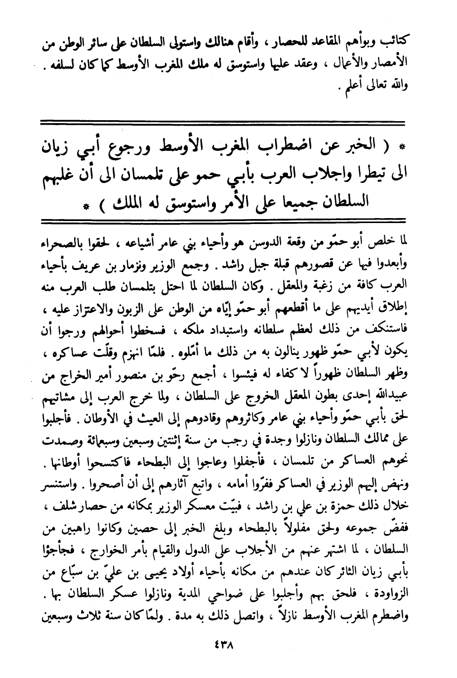 (الخبر عن اضطراب المغرب الأوسط ورجوع أبي زيان الى تيطرا واجلاب العرب بأبي حمو على تلمسان الى أن غلبهم السلطان جميعا على الأمر واستوسق له الملك)