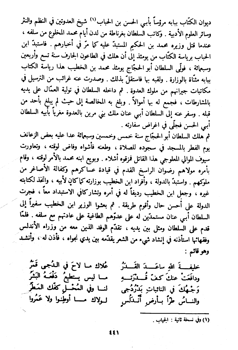 ديوان الكتّاب ببابه مرءوسا بأبي الحسن بن الحباب [1] شيخ العدوتين في النظم والنثر وسائر العلوم الأدبية. وكاتب السلطان بغرناطة من لدن أيام محمد المخلوع من سلفه، عند ما قتل وزيره محمد بن الحكيم المستبدّ عليه كما مرّ في أخبارهم. فاستبدّ ابن الحباب برياسة الكتّاب من يومئذ إلى أن هلك في الطاعون الجارف سنة تسع وأربعين وسبعمائة، فولّى السلطان أبو الحجّاج يومئذ محمد بن الخطيب هذا رياسة الكتاب ببابه مثنّاة بالوزارة. ولقبه بها فاستقلّ بذلك. وصدرت عنه غرائب من الترسيل في مكاتبات جيرانهم من ملوك العدوة. ثم داخله السلطان في تولية العمّال على يديه بالمشارطات، فجمع له بها أموالا. وبلغ به المخالصة إلى حيث لم يبلغ بأحد من قبله. وسفر عنه إلى السلطان أبي عنان ملك بني مرين بالعدوة مغريا بأبيه السلطان أبي الحسن فجلّى في أغراض سفارته.