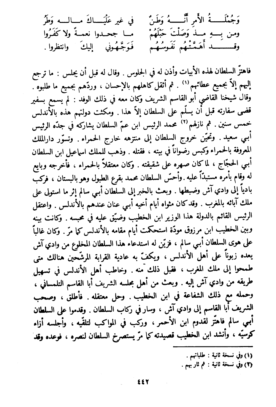 وقال شيخنا القاضي أبو القاسم الشريف وكان معه في ذلك الوفد: لم يسمع بسفير قضى سفارته قبل أن يسلّم على السلطان إلّا هذا. ومكثت دولتهم هذه بالأندلس خمس سنين. ثم نازلهم [2] محمد الرئيس ابن عمّ السلطان يشاركه في جدّه الرئيس أبي سعيد. وتحيّن خروج السلطان إلى منتزهه خارج الحمراء. وتسوّر دار الملك المعروفة بالحمراء وكبس رضوانا في بيته، فقتله. وذهب للملك إسماعيل ابن السلطان أبي الحجّاج، لما كان صهره على شقيقته. وكان معتقلا بالحمراء، فأخرجه وبايع له وقام بأمره مستبدّا عليه. وأحسّ السلطان محمد بقرع الطبول وهو بالبستان، فركب باديا إلى وادي آش وضبطها. وبعث بالخبر إلى السلطان أبي سالم إثر ما استولى على ملك آبائه بالمغرب. وقد كان مثواه أيام أخيه أبي عنان عندهم بالأندلس. واعتقل الرئيس القائم بالدولة هذا الوزير ابن الخطيب وضيّق عليه في محبسه. وكانت بينه وبين الخطيب ابن مرزوق مودّة استحكمت أيام مقامه بالأندلس كما مرّ. وكان غالبا على هوى السلطان أبي سالم، فزيّن له استدعاء هذا السلطان المخلوع من وادي آش يعده زبونا على أهل الأندلس، ويكفّ به عادية القرابة المرشّحين هنالك متى طمحوا إلى ملك المغرب، فقبل ذلك منه. وخاطب أهل الأندلس في تسهيل طريقه من وادي آش إليه. وبعث من أهل مجلسه الشريف أبا القاسم التلمساني، وحمله مع ذلك الشفاعة في ابن الخطيب. وحل معتقله. فأطلق، وصحب الشريف أبا القاسم إلى وادي آش، وسار في ركاب السلطان. وقدموا على السلطان أبي سالم فاهتزّ لقدوم ابن الأحمر، وركب في المواكب لتلقّيه، وأجلسه إزاء كرسيّه، وأنشد ابن الخطيب قصيدته كما مرّ يستصرخ السلطان لنصره، فوعده وقد