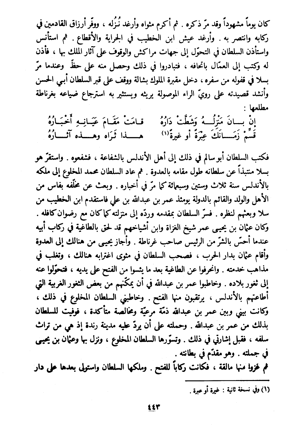 كان يوما مشهودا وقد مرّ ذكره. ثم أكرم مثواه وأرغد نزله، ووفّر أرزاق القادمين في ركابه وانتصر به. وأرغد عيش ابن الخطيب في الجراية والأقطاع. ثم استأنس واستأذن السلطان في التحوّل إلى جهات مراكش والوقوف على آثار الملك بها، فأذن له وكتب إلى العمّال باتحافه، فتبادروا في ذلك وحصل منه على حظّ وعند ما مرّ بسلا في قفوله من سفره، دخل مقبرة الملوك بشالة ووقف على قبر السلطان أبي الحسن وأنشد قصيدته على رويّ الراء الموصولة يريثه ويستثير به استرجاع ضياعه بغرناطة مطلعها: