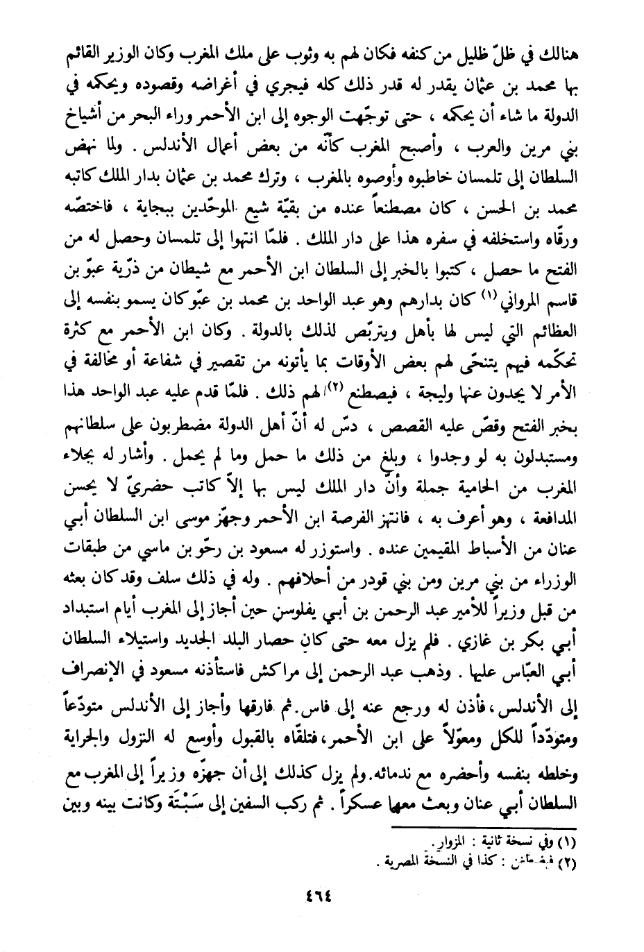 هنالك في ظلّ ظليل من كنفه فكان لهم به وثوب على ملك المغرب وكان الوزير القائم بها محمد بن عثمان يقدر له قدر ذلك كله فيجري في أغراضه وقصوده ويحكمه في الدولة ما شاء أن يحكمه، حتى توجّهت الوجوه إلى ابن الأحمر وراء البحر من أشياخ بني مرين والعرب، وأصبح المغرب كأنّه من بعض أعمال الأندلس. ولما نهض السلطان إلى تلمسان خاطبوه وأوصوه بالمغرب، وترك محمد بن عثمان بدار الملك كاتبه محمد بن الحسن، كان مصطنعا عنده من بقيّة شيع الموحّدين ببجاية، فاختصّه ورقّاه واستخلفه في سفره هذا على دار الملك. فلمّا انتهوا إلى تلمسان وحصل له من الفتح ما حصل، كتبوا بالخبر إلى السلطان ابن الأحمر مع شيطان من ذرّية عبّو بن قاسم المرواني [1] كان بدارهم وهو عبد الواحد بن محمد بن عبّو كان يسمو بنفسه إلى العظائم التي ليس لها بأهل ويتربّص لذلك بالدولة. وكان ابن الأحمر مع كثرة تحكّمه فيهم يتنحّى لهم بعض الأوقات بما يأتونه من تقصير في شفاعة أو مخالفة في الأمر لا يجدون عنها وليجة، فيصطنع [2] لهم ذلك. فلمّا قدم عليه عبد الواحد هذا بخبر الفتح وقصّ عليه القصص، دسّ له أنّ أهل الدولة مضطربون على سلطانهم ومستبدلون به لو وجدوا، وبلغ من ذلك ما حمل وما لم يحمل. وأشار له بجلاء المغرب من الحامية جملة وأنّ دار الملك ليس بها إلّا كاتب حضريّ لا يحسن المدافعة، وهو أعرف به، فانتهز الفرصة ابن الأحمر وجهّز موسى ابن السلطان أبي عنان من الأسباط المقيمين عنده. واستوزر له مسعود بن رحّو بن ماسي من طبقات الوزراء من بني مرين ومن بني قودر من أحلافهم. وله في ذلك سلف وقد كان بعثه من قبل وزيرا للأمير عبد الرحمن بن أبي يفلوسن حين أجاز إلى المغرب أيام استبداد أبي بكر بن غازي. فلم يزل معه حتى كان حصار البلد الجديد واستيلاء السلطان أبي العبّاس عليها. وذهب عبد الرحمن إلى مراكش فاستأذنه مسعود في الانصراف إلى الأندلس، فأذن له ورجع عنه إلى فاس. ثم فارقها وأجاز إلى الأندلس متودّعا ومتودّدا للكل ومعوّلا على ابن الأحمر، فتلقّاه بالقبول وأوسع له النزول والجراية وخلطه بنفسه وأحضره مع ندمائه. ولم يزل كذلك إلى أن جهّزه وزيرا إلى المغرب مع السلطان أبي عنان وبعث معهما عسكرا. ثم ركب السفين إلى سبتة وكانت بينه وبين