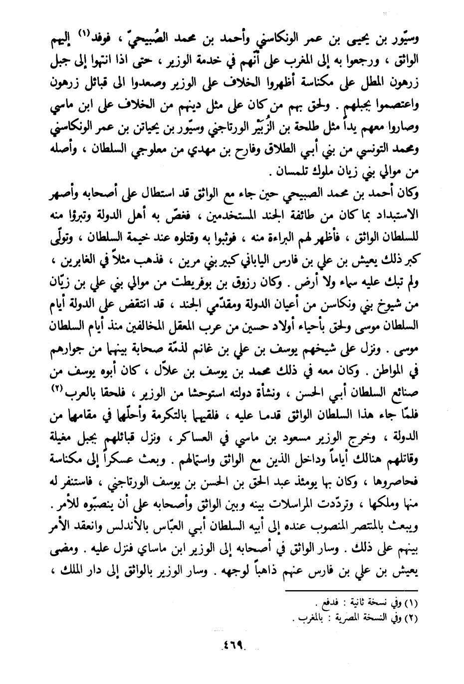 وسيّور بن يحيى بن عمر الونكاسني وأحمد بن محمد الصبيحيّ، فوفد [1] إليهم الواثق، ورجعوا به إلى المغرب على أنّهم في خدمة الوزير، حتى إذا انتهوا إلى جبل زرهون المطل على مكناسة أظهروا الخلاف على الوزير وصعدوا الى قبائل زرهون واعتصموا بجبلهم. ولحق بهم من كان على مثل دينهم من الخلاف على ابن ماسي وصاروا معهم يدا مثل طلحة بن الزبير الورتاجني وسيّور بن يحياتن بن عمر الونكاسني ومحمد التونسي من بني أبي الطلاق وفارح بن مهدي من معلوجي السلطان، وأصله من موالي بني زيان ملوك تلمسان.