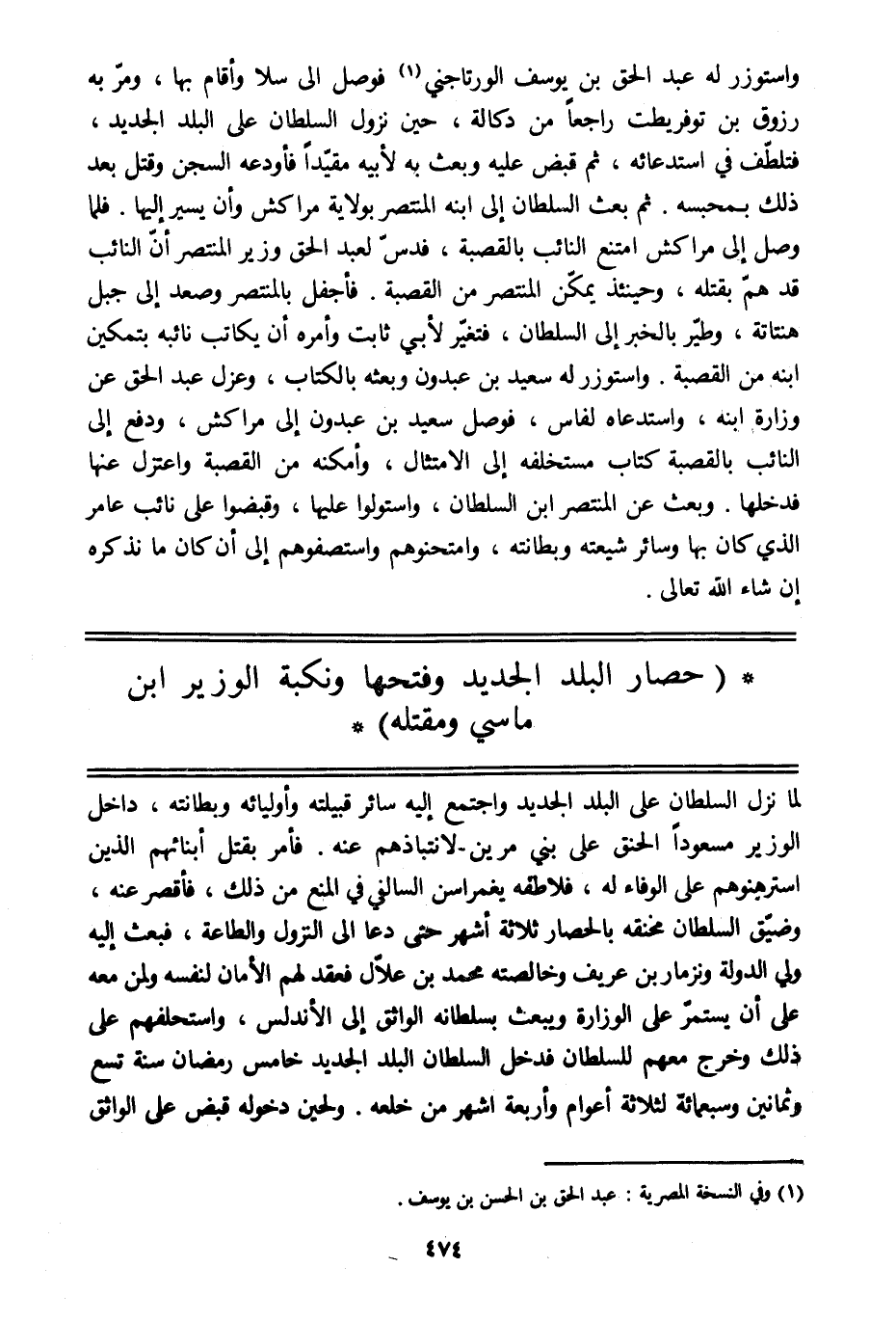 واستوزر له عبد الحق بن يوسف الورتاجني [1] فوصل الى سلا وأقام بها، ومرّ به رزوق بن توفريطت راجعا من دكالة، حين نزول السلطان على البلد الجديد، فتلطّف في استدعائه، ثم قبض عليه وبعث به لأبيه مقيّدا فأودعه السجن وقتل بعد ذلك بمحبسه. ثم بعث السلطان إلى ابنه المنتصر بولاية مراكش وأن يسير إليها. فلما وصل إلى مراكش امتنع النائب بالقصبة، فدسّ لعبد الحق وزير المنتصر أنّ النائب قد همّ بقتله، وحينئذ يمكّن المنتصر من القصبة. فأجفل بالمنتصر وصعد إلى جبل هنتاتة، وطيّر بالخبر إلى السلطان، فتغيّر لأبي ثابت وأمره أن يكاتب نائبة بتمكين ابنه من القصبة. واستوزر له سعيد بن عبدون وبعثه بالكتاب، وعزل عبد الحق عن وزارة ابنه، واستدعاه لفاس، فوصل سعيد بن عبدون إلى مراكش، ودفع إلى النائب بالقصبة كتاب مستخلفه إلى الامتثال، وأمكنه من القصبة واعتزل عنها فدخلها. وبعث عن المنتصر ابن السلطان، واستولوا عليها، وقبضوا على نائب عامر الّذي كان بها وسائر شيعته وبطانته، وامتحنوهم واستصفوهم إلى أن كان ما نذكره إن شاء الله تعالى.