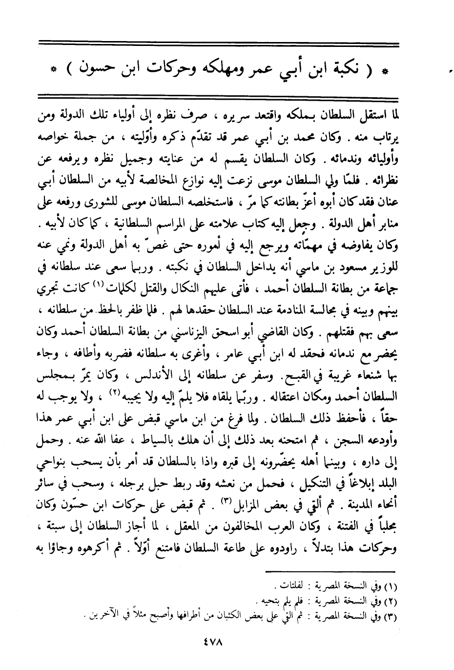 وكان يفاوضه في مهمّاته ويرجع إليه في أموره حتى غصّ به أهل الدولة ونمي عنه للوزير مسعود بن ماسي أنه يداخل السلطان في نكبته. وربما سعى عند سلطانه في جماعة من بطانة السلطان أحمد، فأتى عليهم النكال والقتل لكلمات [1] كانت تجري بينهم وبينه في مجالسة المنادمة عند السلطان حقدها لهم. فلما ظفر بالحظ من سلطانه، سعى بهم فقتلهم. وكان القاضي أبو إسحاق اليزناسني من بطانة السلطان أحمد وكان يحضر مع ندمائه فحقد له ابن أبي عامر، وأغرى به سلطانه فضربه وأطافه، وجاء بها شنعاء غريبة في القبح. وسفر عن سلطانه إلى الأندلس، وكان يمرّ بمجلس السلطان أحمد ومكان اعتقاله. وربّما يلقاه فلا يلمّ إليه ولا يجيبه [2] ، ولا يوجب له حقا، فأحفظ ذلك السلطان. ولما فرغ من ابن ماسي قبض على ابن أبي عمر هذا وأودعه السجن، ثم امتحنه بعد ذلك إلى أن هلك بالسياط، عفا الله عنه. وحمل إلى داره، وبينما أهله يحضّرونه إلى قبره وإذا بالسلطان قد أمر بأن يسحب بنواحي البلد إبلاغا في التنكيل، فحمل من نعشه وقد ربط حبل برجله، وسحب في سائر أنحاء المدينة. ثم ألقي في بعض المزابل [3] . ثم قبض على حركات ابن حسّون وكان مجلبا في الفتنة، وكان العرب المخالفون من المعقل، لما أجاز السلطان إلى سبتة، وحركات هذا بتدلّا، راودوه على طاعة السلطان فامتنع أوّلا. ثم أكرهوه وجاءوا به