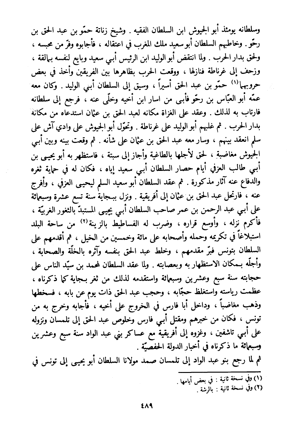 وسلطانه يومئذ أبو الجيوش ابن السلطان الفقيه. وشيخ زناتة حمّو بن عبد الحق بن رحّو. وخاطبهم السلطان أبو سعيد ملك المغرب في اعتقاله، فأجابوه وفرّ من محبسه، ولحق بدار الحرب. ولما انتقض أبو الوليد ابن الرئيس أبي سعيد وبايع لنفسه بمالقة، وزحف إلى غرناطة فنازلها، ووقعت الحرب بظاهرها بين الفريقين وأخذ في بعض حروبهما [1] حمّو بن عبد الحق أسيرا، وسيق إلى السلطان أبي الوليد. وكان معه عمّه أبو العبّاس بن رحّو فأبى من اسار ابن أخيه وخلّى عنه، فرجع إلى سلطانه فارتاب به لذلك. وعقد على الغزاة مكانه لعبد الحق بن عثمان استدعاه من مكانه بدار الحرب. ثم غلبهم أبو الوليد على غرناطة. وتحوّل أبو الجيوش على وادي آش على سلم انعقد بينهم، وسار معه عبد الحق بن عثمان على شأنه. ثم وقعت بينه وبين أبي الجيوش مغاضبة، لحق لأجلها بالطاغية وأجاز إلى سبتة، فاستظهر به أبو يحيى بن أبي طالب العزفي أيام حصار السلطان أبي سعيد إياه، فكان له في حماية ثغره والدفاع عنه آثار مذكورة. ثم عقد السلطان أبو سعيد السلم ليحيى العزفي، وأفرج عنه، فارتحل عبد الحق بن عثمان إلى إفريقية. ونزل ببجاية سنة تسع عشرة وسبعمائة على أبي عبد الرحمن بن عمر صاحب السلطان أبي يحيى المستبدّ بالثغور الغربيّة، فأكرم نزله، وأوسع قراره، وضرب له الفساطيط بالزينة [2] من ساحة البلد استبلاغا في تكريمه وحمله وأصحابه على مائة وخمسين من الخيل، ثم أقدمهم على السلطان بتونس فبرّ مقدمهم، وخلط عبد الحق بنفسه وآثره بالخلّة والصحابة، وأجلّه بمكان الاستظهار به وبعصابته. ولما عقد السلطان لمحمد بن سيّد الناس على حجابته سنة سبع وعشرين وسبعمائة واستقدمه لذلك من ثغر بجاية كما ذكرناه، عظمت رياسته واستغلظ حجّابه، وحجب عبد الحق ذات يوم عن بابه، فسخطها وذهب مغاضبا، وداخل أبا فارس في الخروج على أخيه، فأجابه وخرج به من تونس، فكان من خبرهم ومقتل أبي فارس وخلوص عبد الحق إلى تلمسان ونزوله على أبي تاشفين، وغزوة إلى إفريقية مع عساكر بني عبد الواد سنة سبع وعشرين وسبعمائة ما ذكرناه في أخبار الدولة الحفصيّة.