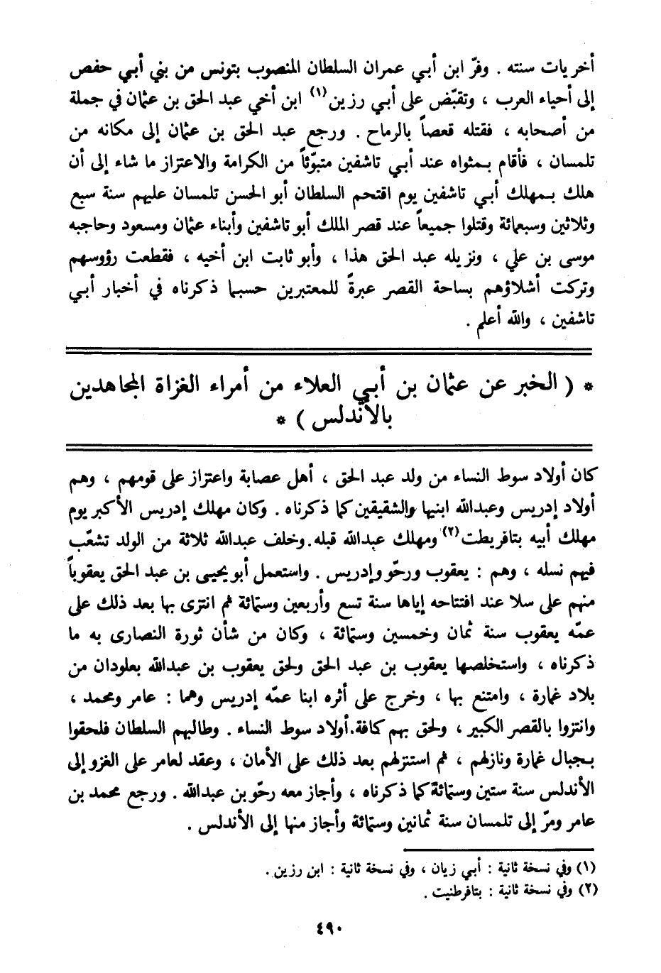 أخريات سنته. وفرّ ابن أبي عمران السلطان المنصوب بتونس من بني أبي حفص إلى أحياء العرب، وتقبّض على أبي رزين [1] ابن أخي عبد الحق بن عثمان في جملة من أصحابه، فقتله قعصا بالرماح. ورجع عبد الحق بن عثمان إلى مكانه من تلمسان، فأقام بمثواه عند أبي تاشفين متبوّئا من الكرامة والاعتزاز ما شاء إلى أن هلك بمهلك أبي تاشفين يوم اقتحم السلطان أبو الحسن تلمسان عليهم سنة سبع وثلاثين وسبعمائة وقتلوا جميعا عند قصر الملك أبو تاشفين وأبناء عثمان ومسعود وحاجبه موسى بن علي، ونزيله عبد الحق هذا، وأبو ثابت ابن أخيه، فقطعت رءوسهم وتركت أشلاؤهم بساحة القصر عبرة للمعتبرين حسبما ذكرناه في أخبار أبي تاشفين، والله أعلم.