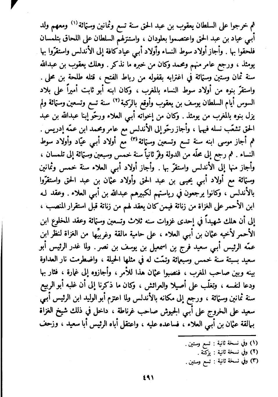 ثم أجاز موسى ابنه سنة تسع وتسعين وستمائة [3] مع أولاد أبي عيّاد وأولاد سوط النساء. ثم رجع إلى محلّه من الدولة وفرّ ثانيا سنة خمس وسبعين وستمائة إلى تلمسان، وأجاز منها إلى الأندلس واستقرّ بها. وأجاز أولاد أبي العلاء سنة خمس وثمانين وستمائة مع أولاد أبي يحيى بن عبد الحق وأولاد عثمان بن عبد الحق واستقرّوا بالأندلس، وكانوا يرجعون في رياستهم لكبيرهم عبد الله بن أبي العلاء. وعقد له ابن الأحمر على الغزاة من زناتة فيمن كان يعقد لهم من زناتة قبل استقرار المنصب، إلى أن هلك شهيدا في إحدى غزوات سنة ثلاث وتسعين وستمائة وعقد المخلوع ابن الأحمر لأخيه عثمان بن أبي العلاء، على حامية مالقة وغربيّها من الغزاة لنظر ابن عمّه الرئيس أبي سعيد فرج بن إسماعيل بن يوسف بن نصر. ولما غدر الرئيس أبو سعيد بسبتة سنة خمس وسبعمائة وتمّت له في مثلها الحيلة، واضطرمت نار العداوة بينه وبين صاحب المغرب، فنصبوا عثمان هذا للأمر، وأجازوه إلى غمارة، فثار بها ودعا لنفسه، وتغلّب على أصيلا والعرائش، وكان ما ذكرنا إلى أن غلبه أبو الربيع سنة ثمانين وستمائة، ورجع إلى مكانه بالأندلس ولما اعتزم أبو الوليد ابن الرئيس أبي سعيد على الخروج على أبي الجيوش صاحب غرناطة، داخل في ذلك شيخ الغزاة بمالقة عثمان بن أبي العلاء، فساعده عليه، واعتقل أباه الرئيس أبا سعيد، وزحف