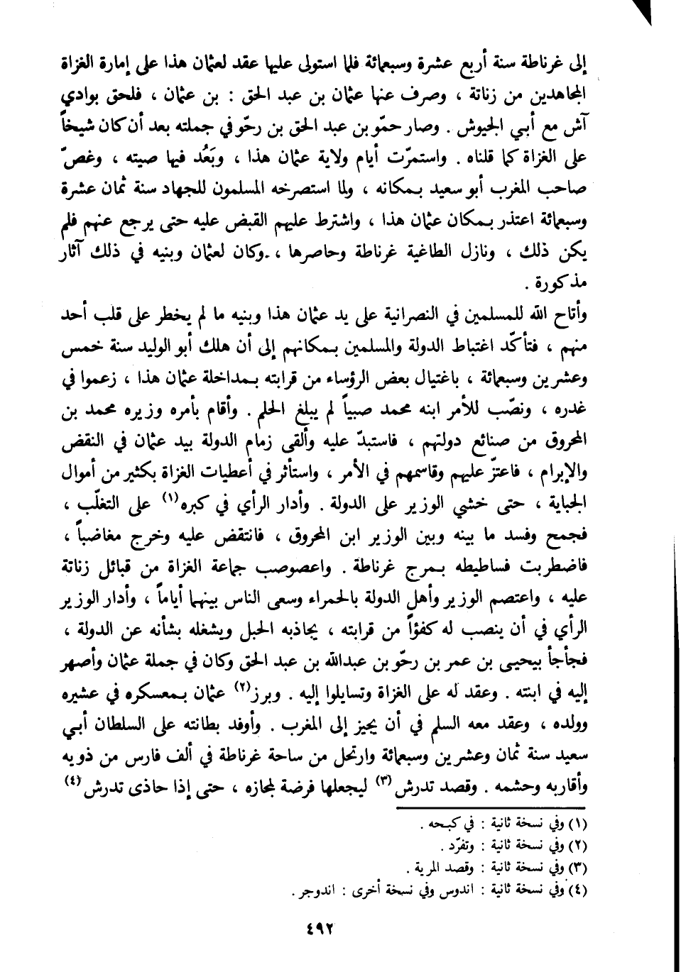 إلى غرناطة سنة أربع عشرة وسبعمائة فلما استولى عليها عقد لعثمان هذا على إمارة الغزاة المجاهدين من زناتة، وصرف عنها عثمان بن عبد الحق: بن عثمان، فلحق بوادي آش مع أبي الجيوش. وصار حمّو بن عبد الحق بن رحّو في جملته بعد أن كان شيخا على الغزاة كما قلناه. واستمرّت أيام ولاية عثمان هذا، وبعد فيها صيته، وغصّ صاحب المغرب أبو سعيد بمكانه، ولما استصرخه المسلمون للجهاد سنة ثمان عشرة وسبعمائة اعتذر بمكان عثمان هذا، واشترط عليهم القبض عليه حتى يرجع عنهم فلم يكن ذلك، ونازل الطاغية غرناطة وحاصرها، وكان لعثمان وبنيه في ذلك آثار مذكورة.