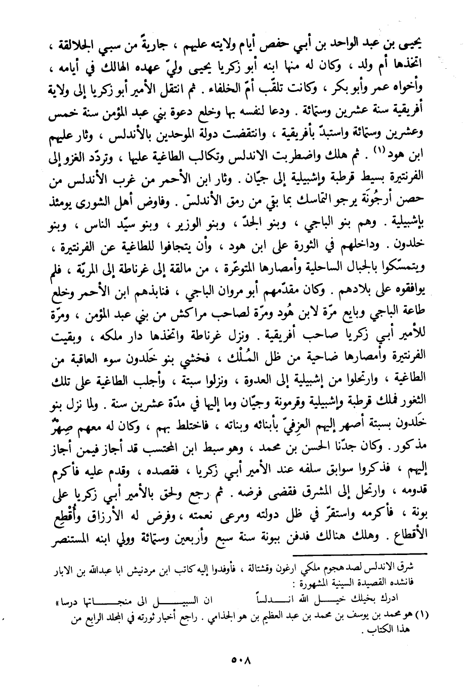 يحيى بن عبد الواحد بن أبي حفص أيام ولايته عليهم، جارية من سبي الجلالقة، اتخذها أم ولد، وكان له منها ابنه أبو زكريا يحيى وليّ عهده الهالك في أيامه، وأخواه عمر وأبو بكر، وكانت تلقّب أمّ الخلفاء. ثم انتقل الأمير أبو زكريا إلى ولاية إفريقية سنة عشرين وستمائة. ودعا لنفسه بها وخلع دعوة بني عبد المؤمن سنة خمس وعشرين وستمائة واستبدّ بإفريقية، وانتقضت دولة الموحدين بالأندلس، وثار عليهم ابن هود [1] . ثم هلك واضطربت الأندلس وتكالب الطاغية عليها، وتردّد الغزو إلى الفرنتيرة بسيط قرطبة وإشبيلية إلى جيّان. وثار ابن الأحمر من غرب الأندلس من حصن أرجونة يرجو التماسك بما بقي من رمق الأندلس. وفاوض أهل الشورى يومئذ بإشبيليّة. وهم بنو الباجي، وبنو الجدّ، وبنو الوزير، وبنو سيّد الناس، وبنو خلدون. وداخلهم في الثورة على ابن هود، وأن يتجافوا للطاغية عن الفرنتيرة، ويتمسّكوا بالجبال الساحلية وأمصارها المتوعّرة، من مالقة إلى غرناطة إلى المريّة، فلم يوافقوه على بلادهم. وكان مقدّمهم أبو مروان الباجي، فنابذهم ابن الأحمر وخلع طاعة الباجي وبايع مرّة لابن هود ومرّة لصاحب مراكش من بني عبد المؤمن، ومرّة للأمير أبي زكريا صاحب إفريقية. ونزل غرناطة واتخذها دار ملكه، وبقيت الفرنتيرة وأمصارها ضاحية من ظل الملك، فخشي بنو خلدون سوء العاقبة من الطاغية، وارتحلوا من إشبيلية إلى العدوة، ونزلوا سبتة، وأجلب الطاغية على تلك الثغور فملك قرطبة وإشبيلية وقرمونة وجيّان وما إليها في مدّة عشرين سنة. ولما نزل بنو خلدون بسبتة أصهر إليهم العزفيّ بأبنائه وبناته، فاختلط بهم، وكان له معهم صهر مذكور. وكان جدّنا الحسن بن محمد، وهو سبط ابن المحتسب قد أجاز فيمن أجاز إليهم، فذكروا سوابق سلفه عند الأمير أبي زكريا، فقصده، وقدم عليه فأكرم قدومه، وارتحل إلى المشرق فقضى فرضه. ثم رجع ولحق بالأمير أبي زكريا على بونة، فأكرمه واستقرّ في ظل دولته ومرعى نعمته، وفرض له الأرزاق وأقطع الأقطاع. وهلك هنالك فدفن ببونة سنة سبع وأربعين وستمائة وولي ابنه المستنصر