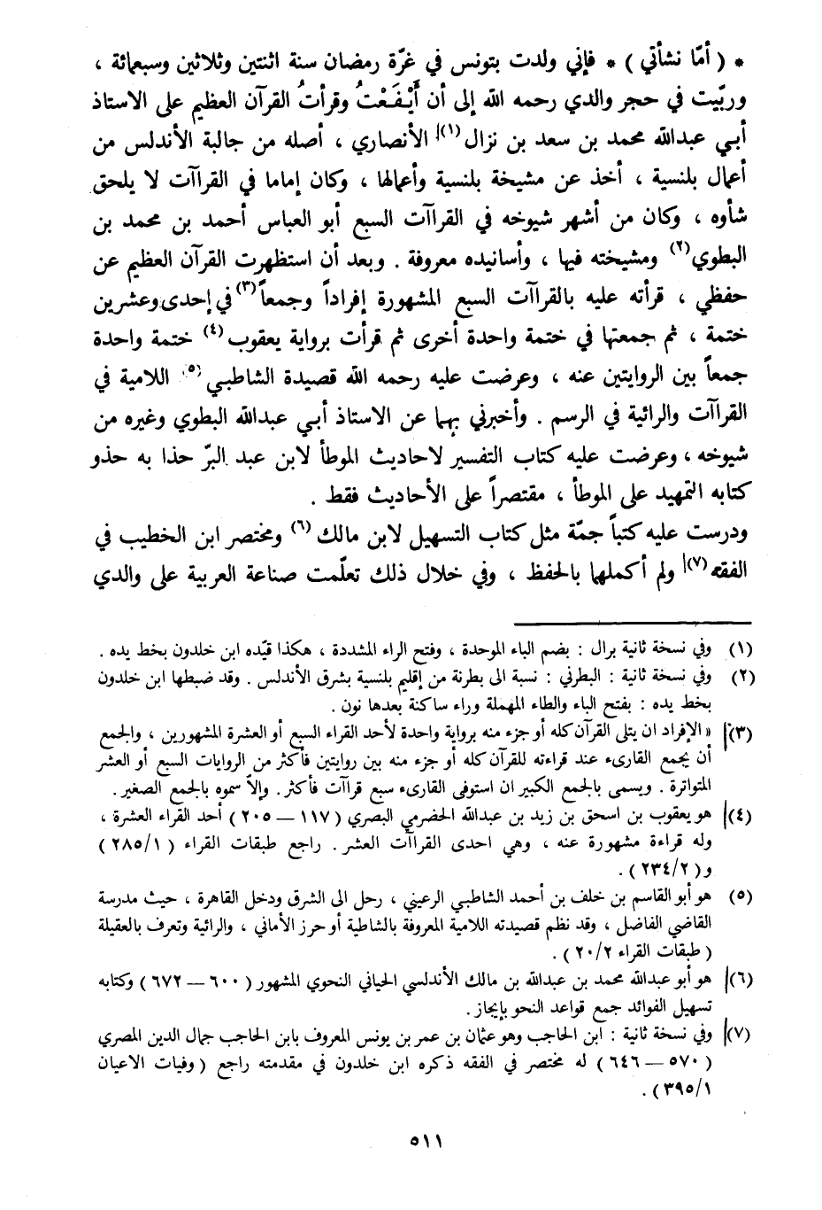 (أمّا نشأتي) فإنّي ولدت بتونس في غرّة رمضان سنة اثنتين وثلاثين وسبعمائة، وربّيت في حجر والدي رحمه الله إلى أن أيفعت وقرأت القرآن العظيم على الأستاذ أبي عبد الله محمد بن سعد بن نزال [1] الأنصاري، أصله من جالبة الأندلس من أعمال بلنسية، أخذ عن مشيخة بلنسية وأعمالها، وكان إماما في القراءات لا يلحق شأوه، وكان من أشهر شيوخه في القراءات السبع أبو العباس أحمد بن محمد بن البطوي [2] ومشيخته فيها، وأسانيده معروفة. وبعد أن استظهرت القرآن العظيم عن حفظي، قرأته عليه بالقراءات السبع المشهورة إفرادا وجمعا [3] في إحدى وعشرين ختمة، ثم جمعتها في ختمة واحدة أخرى ثم قرأت برواية يعقوب [4] ختمة واحدة جمعا بين الروايتين عنه، وعرضت عليه رحمه الله قصيدة الشاطبي [5] اللامية في القراءات والرائية في الرسم. وأخبرني بهما عن الأستاذ أبي عبد الله البطوي وغيره من شيوخه، وعرضت عليه كتاب التفسير لأحاديث الموطأ لابن عبد البرّ حذا به حذو كتابه التمهيد على الموطأ، مقتصرا على الأحاديث فقط.