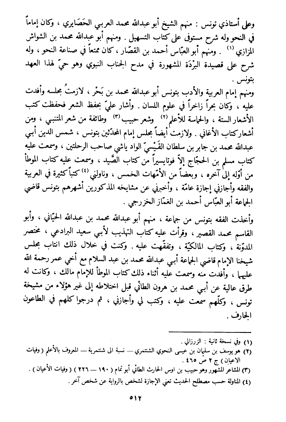 ومنهم إمام العربية والأدب بتونس أبو عبد الله محمد بن بحر، لازمت مجلسه وأفدت عليه، وكان بحرا زاخرا في علوم اللسان. وأشار عليّ بحفظ الشعر فحفظت كتب الأشعار الستة، والحماسة للأعلم [2] وشعر حبيب [3] وطائفة من شعر المتنبي، ومن أشعار كتاب الأغاني. ولازمت أيضا مجلس إمام المحدّثين بتونس، شمس الدين أبي عبد الله محمد بن جابر بن سلطان القيسيّ الوادياشي صاحب الرحلتين، وسمعت عليه كتاب مسلم بن الحجّاج إلّا فوتا يسيرا من كتاب الصّيد، وسمعت عليه كتاب الموطأ من أوّله إلى آخره، وبعضا من الأمّهات الخمس، وناولني [4] كتبا كثيرة في العربية والفقه وأجازني إجازة عامّة، وأخبرني عن مشايخه المذكورين أشهرهم بتونس قاضي الجماعة أبو العبّاس أحمد بن الغمّاز الخزرجي.
