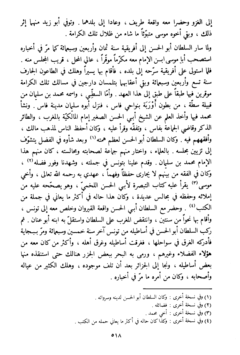 فلما استولى على إفريقية سرّحه إلى بلده، فأقام بها يسيرا وهلك في الطاعون الجارف سنة تسع وأربعين وسبعمائة وبقي أعقابهما بتلمسان دارجين في مسالك تلك الكرامة موقرين فيها طبقا على طبق إلى هذا العهد. وأمّا السطّي، واسمه محمد بن سليمان من قبيلة سطّة، من بطون أوربة بنواحي فاس، فنزل أبوه سليمان مدينة فاس. ونشأ محمد فيها وأخذ العلم عن الشيخ أبي الحسن الصغير إمام المالكيّة بالمغرب، والطائر الذكر وقاضي الجماعة بفاس، وتفقّه وقرأ عليه، وكان أحفظ الناس لمذهب مالك، وأفقههم فيه. وكان السلطان أبو الحسن لعظم همته [1] وبعد شأوه في الفضل يتشوّف إلى تزيين مجلسه. بالعلماء، واختار منهم جماعة لصحابته ومجالسته، كان منهم هذا الإمام محمد بن سليمان. وقدم علينا بتونس في جملته، وشهدنا وفور فضله [2] ، وكان في الفقه من بينهم لا يجارى حفظا وفهما، عهدي به رحمه الله تعالى، وأخي موسى [3] يقرأ عليه كتاب التبصرة لأبي الحسن اللخميّ، وهو يصحّحه عليه من إملائه وحفظه في مجالس عديدة، وكان هذا حاله في أكثر ما يعاني في جملة من الكتب [4] . وحضر مع السلطان أبي الحسن واقعة القيروان وخلص معه إلى تونس، وأقام بها نحوا من سنتين، وانتقض المغرب على السلطان واستقلّ به ابنه أبو عنان. ثم ركب السلطان أبو الحسن في أساطيله من تونس آخر سنة خمسين وسبعمائة ومرّ ببجاية فأدركه الغرق في سواحلها، فغرقت أساطيله وغرق أهله، وأكثر من كان معه من هؤلاء الفضلاء وغيرهم، ورمى به البحر ببعض الجزر هنالك حتى استنقذه منها بعض أساطيله، ونجا إلى الجزائر بعد أن تلف موجودة، وهلك الكثير من عياله وأصحابه، وكان من أمره ما مرّ في أخباره.