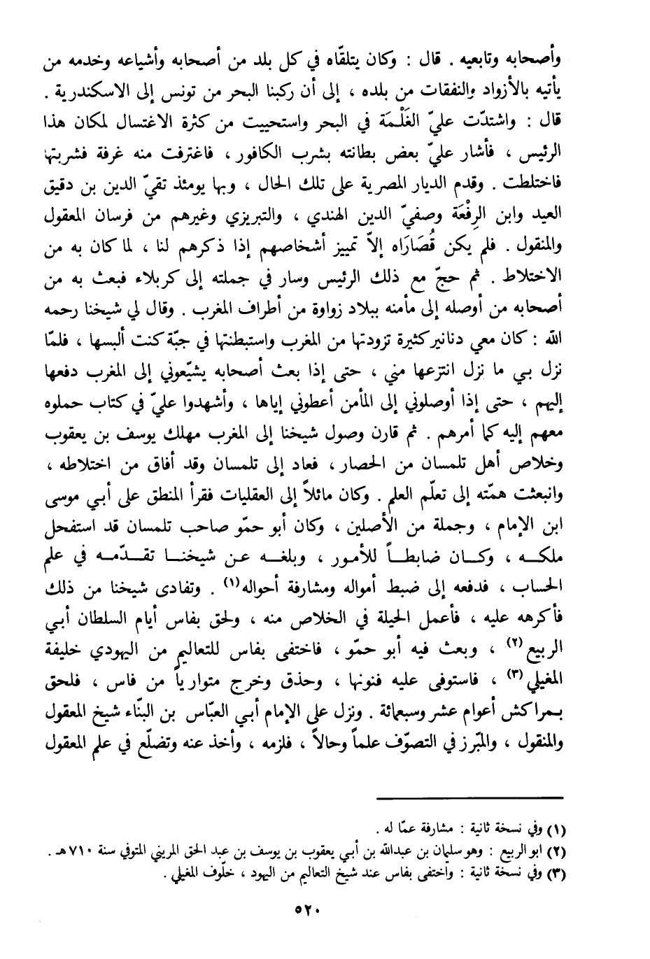 قال: واشتدّت عليّ الغلمة في البحر واستحييت من كثرة الاغتسال لمكان هذا الرئيس، فأشار عليّ بعض بطانته بشرب الكافور، فاغترفت منه غرفة فشربتها فاختلطت. وقدم الديار المصرية على تلك الحال، وبها يومئذ تقيّ الدين بن دقيق العيد وابن الرفعة وصفيّ الدين الهندي، والتبريزي وغيرهم من فرسان المعقول والمنقول. فلم يكن قصاراه إلّا تمييز أشخاصهم إذا ذكرهم لنا، لما كان به من الاختلاط. ثم حجّ مع ذلك الرئيس وسار في جملته إلى كربلاء فبعث به من أصحابه من أوصله إلى مأمنه ببلاد زواوة من أطراف المغرب. وقال لي شيخنا رحمه الله: كان معي دنانير كثيرة تزودتها من المغرب واستبطنتها في جبّة كنت ألبسها، فلمّا نزل بي ما نزل انتزعها مني، حتى إذا بعث أصحابه يشيّعوني إلى المغرب دفعها إليهم، حتى إذا أوصلوني إلى المأمن أعطوني إياها، وأشهدوا عليّ في كتاب حملوه معهم إليه كما أمرهم. ثم قارن وصول شيخنا إلى المغرب مهلك يوسف بن يعقوب وخلاص أهل تلمسان من الحصار، فعاد إلى تلمسان وقد أفاق من اختلاطه، وانبعثت همّته إلى تعلّم العلم. وكان مائلا إلى العقليات فقرأ المنطق على أبي موسى ابن الإمام، وجملة من الأصلين، وكان أبو حمّو صاحب تلمسان قد استفحل ملكه، وكان ضابطا للأمور، وبلغه عن شيخنا تقدّمه في علم الحساب، فدفعه إلى ضبط أمواله ومشارفة أحواله [1] . وتفادى شيخنا من ذلك فأكرهه عليه، فأعمل الحيلة في الخلاص منه، ولحق بفاس أيام السلطان أبي الربيع [2] ، وبعث فيه أبو حمّو، فاختفى بفاس للتعاليم من اليهودي خليفة المغيلي [3] ، فاستوفى عليه فنونها، وحذق وخرج متواريا من فاس، فلحق بمراكش أعوام عشر وسبعمائة. ونزل على الإمام أبي العبّاس بن البنّاء شيخ المعقول والمنقول، والمبرّز في التصوّف علما وحالا، فلزمه، وأخذ عنه وتضلّع في علم المعقول