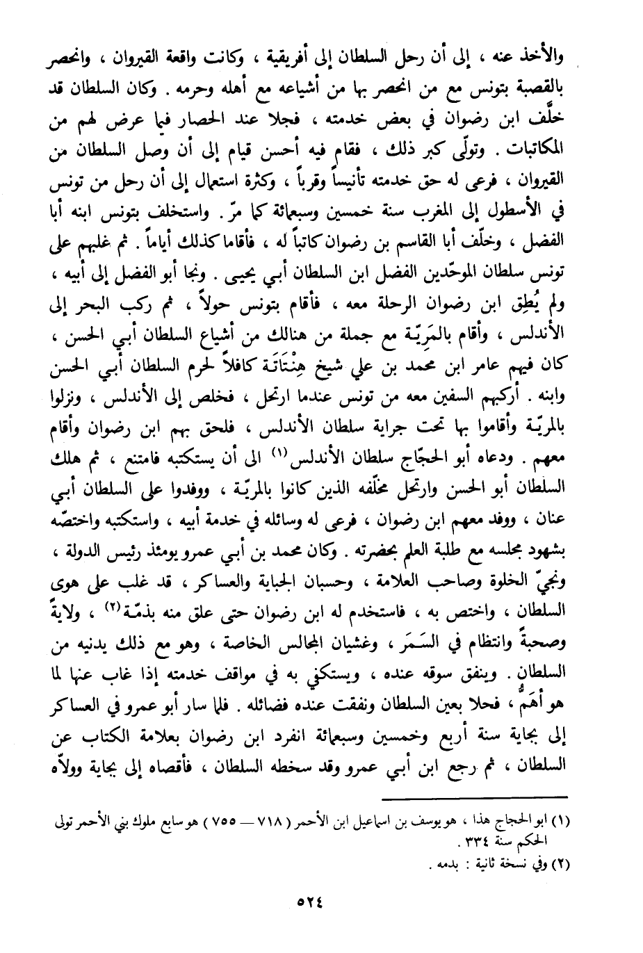 والأخذ عنه، إلى أن رحل السلطان إلى إفريقية، وكانت واقعة القيروان، وانحصر بالقصبة بتونس مع من انحصر بها من أشياعه مع أهله وحرمه. وكان السلطان قد خلّف ابن رضوان في بعض خدمته، فجلا عند الحصار فيما عرض لهم من المكاتبات. وتولّى كبر ذلك، فقام فيه أحسن قيام إلى أن وصل السلطان من القيروان، فرعى له حق خدمته تأنيسا وقربا، وكثرة استعمال إلى أن رحل من تونس في الأسطول إلى المغرب سنة خمسين وسبعمائة كما مرّ. واستخلف بتونس ابنه أبا الفضل، وخلّف أبا القاسم بن رضوان كاتبا له، فأقاما كذلك أياما. ثم غلبهم على تونس سلطان الموحّدين الفضل ابن السلطان أبي يحيى. ونجا أبو الفضل إلى أبيه، ولم يطق ابن رضوان الرحلة معه، فأقام بتونس حولا، ثم ركب البحر إلى الأندلس، وأقام بالمريّة مع جملة من هنالك من أشياع السلطان أبي الحسن، كان فيهم عامر ابن محمد بن علي شيخ هنتاتة كافلا لحرم السلطان أبي الحسن وابنه. أركبهم السفين معه من تونس عند ما ارتحل، فخلص إلى الأندلس، ونزلوا بالمريّة وأقاموا بها تحت جراية سلطان الأندلس، فلحق بهم ابن رضوان وأقام معهم. ودعاه أبو الحجّاج سلطان الأندلس [1] الى أن يستكتبه فامتنع، ثم هلك السلطان أبو الحسن وارتحل مخلّفه الذين كانوا بالمريّة، ووفدوا على السلطان أبي عنان، ووفد معهم ابن رضوان، فرعى له وسائله في خدمة أبيه، واستكتبه واختصّه بشهود مجلسه مع طلبة العلم بحضرته. وكان محمد بن أبي عمرو يومئذ رئيس الدولة، ونجيّ الخلوة وصاحب العلامة، وحسبان الجباية والعساكر، قد غلب على هوى السلطان، واختص به، فاستخدم له ابن رضوان حتى علق منه بذمّة [2] ، ولاية وصحبة وانتظام في السمر، وغشيان المجالس الخاصة، وهو مع ذلك يدنيه من السلطان. وينفق سوقه عنده، ويستكفي به في مواقف خدمته إذا غاب عنها لما هو أهمّ، فحلا بعين السلطان ونفقت عنده فضائله. فلما سار أبو عمرو في العساكر إلى بجاية سنة أربع وخمسين وسبعمائة انفرد ابن رضوان بعلامة الكتاب عن السلطان، ثم رجع ابن أبي عمرو وقد سخطه السلطان، فأقصاه إلى بجاية وولّاه