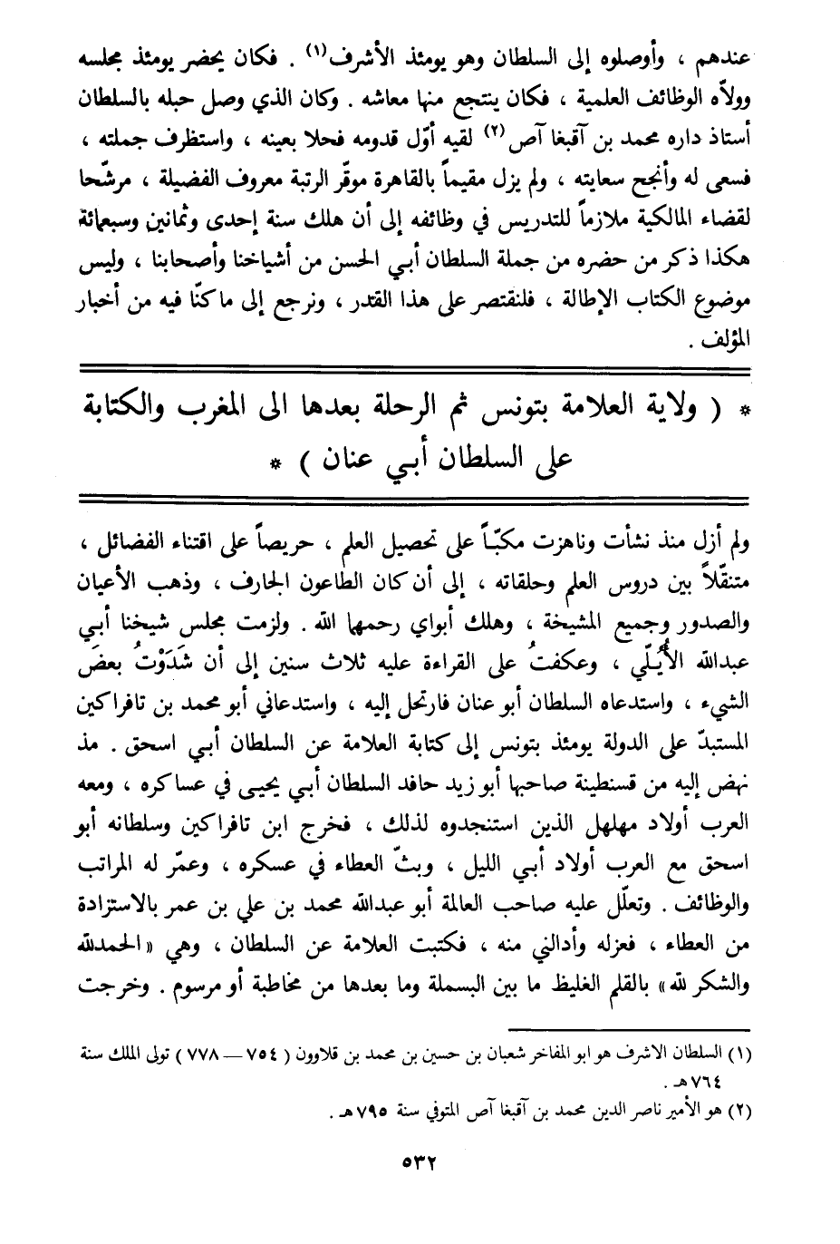 ولم أزل منذ نشأت وناهزت مكبّا على تحصيل العلم، حريصا على اقتناء الفضائل، متنقّلا بين دروس العلم وحلقاته، إلى أن كان الطاعون الجارف، وذهب الأعيان والصدور وجميع المشيخة، وهلك أبواي رحمهما الله. ولزمت مجلس شيخنا أبي عبد الله الأيلّي، وعكفت على القراءة عليه ثلاث سنين إلى أن شدوت بعض الشيء، واستدعاه السلطان أبو عنان فارتحل إليه، واستدعاني أبو محمد بن تافراكين المستبدّ على الدولة يومئذ بتونس إلى كتابة العلامة عن السلطان أبي إسحاق. مذ نهض إليه من قسنطينة صاحبها أبو زيد حافد السلطان أبي يحيى في عساكره، ومعه العرب أولاد مهلهل الذين استنجدوه لذلك، فخرج ابن تافراكين وسلطانه أبو إسحاق مع العرب أولاد أبي الليل، وبثّ العطاء في عسكره، وعمّر له المراتب والوظائف. وتعلّل عليه صاحب العالمة أبو عبد الله محمد بن علي بن عمر بالاستزادة من العطاء، فعزله وأدالني منه، فكتبت العلامة عن السلطان، وهي «الحمد للَّه والشكر للَّه» بالقلم الغليظ ما بين البسملة وما بعدها من مخاطبة أو مرسوم. وخرجت