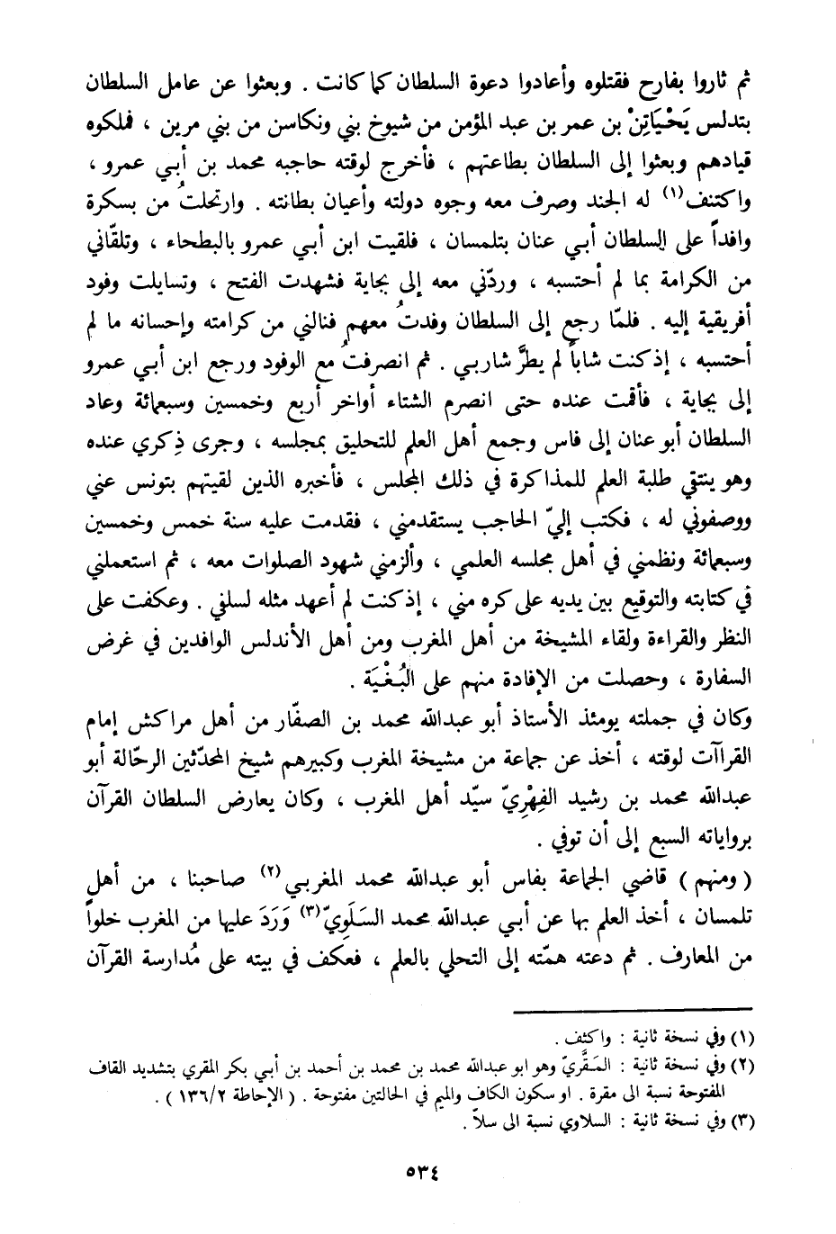 (ومنهم) قاضي الجماعة بفاس أبو عبد الله محمد المغربي [2] صاحبنا، من أهل تلمسان، أخذ العلم بها عن أبي عبد الله محمد السلويّ [3] ورد عليها من المغرب خلوا من المعارف. ثم دعته همّته إلى التحلي بالعلم، فعكف في بيته على مدارسة القرآن