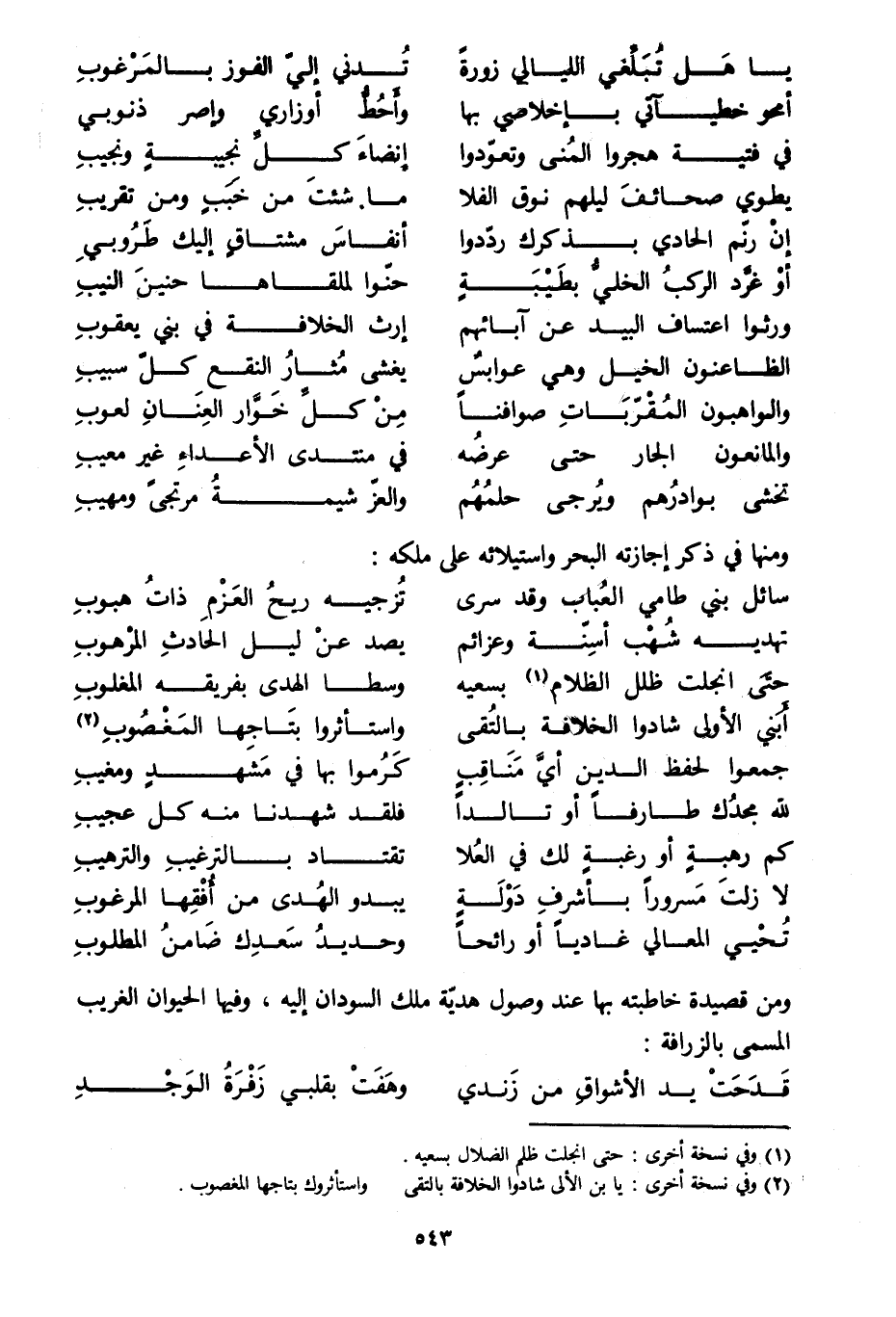 ومن قصيدة خاطبته بها عند وصول هديّة ملك السودان إليه، وفيها الحيوان الغريب المسمى بالزرافة: