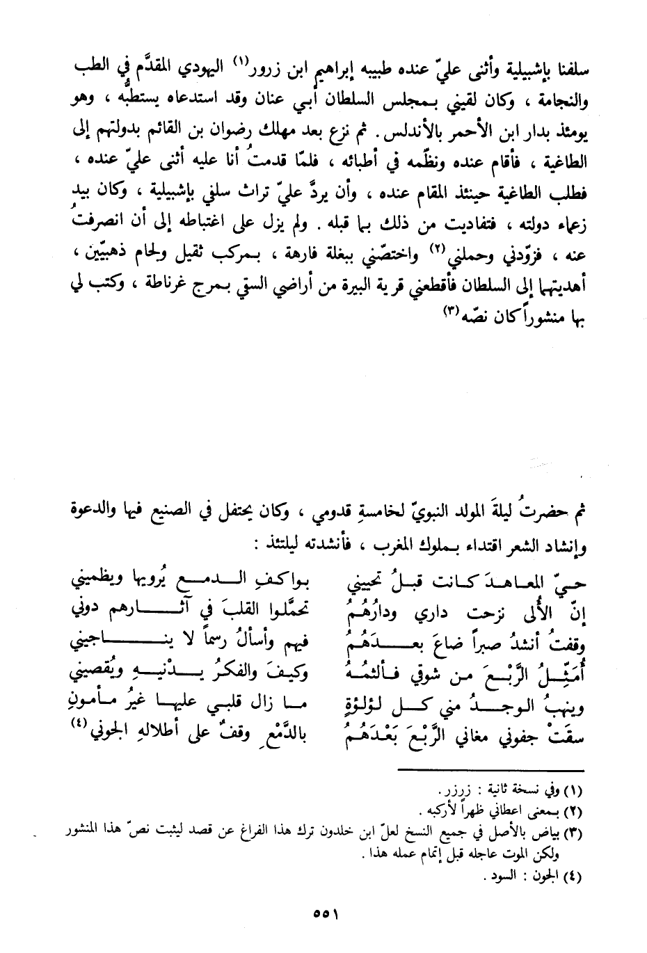 سلفنا بإشبيليّة وأثنى عليّ عنده طبيبه إبراهيم ابن زرور [1] اليهودي المقدّم في الطب والنجامة، وكان لقيني بمجلس السلطان أبي عنان وقد استدعاه يستطبّه، وهو يومئذ بدار ابن الأحمر بالأندلس. ثم نزع بعد مهلك رضوان بن القائم بدولتهم إلى الطاغية، فأقام عنده ونظّمه في أطبائه، فلمّا قدمت أنا عليه أثنى عليّ عنده، فطلب الطاغية حينئذ المقام عنده، وأن يردّ عليّ تراث سلفي بإشبيليّة، وكان بيد زعماء دولته، فتفاديت من ذلك بما قبله. ولم يزل على اغتباطه إلى أن انصرفت عنه، فزوّدني وحملني [2] واختصّني ببغلة فارهة، بمركب ثقيل ولجام ذهبيّين، أهديتهما إلى السلطان فأقطعني قرية البيرة من أراضي السقي بمرج غرناطة، وكتب لي بها منشورا كان نصّه [3] ثم حضرت ليلة المولد النبويّ لخامسة قدومي، وكان يحتفل في الصنيع فيها والدعوة وإنشاد الشعر اقتداء بملوك المغرب، فأنشدته ليلتئذ: