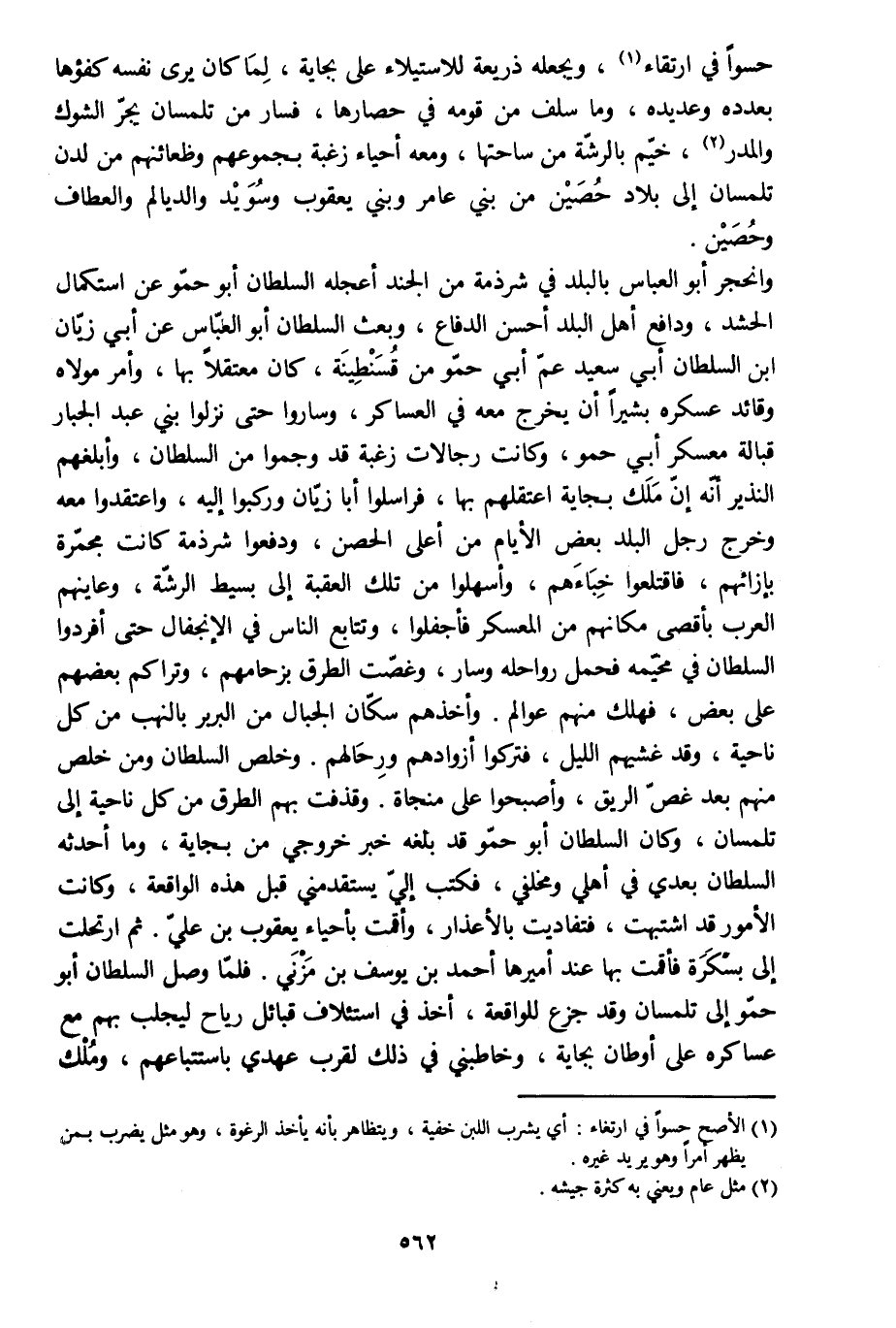 وانحجر أبو العباس بالبلد في شرذمة من الجند أعجله السلطان أبو حمّو عن استكمال الحشد، ودافع أهل البلد أحسن الدفاع، وبعث السلطان أبو العبّاس عن أبي زيّان ابن السلطان أبي سعيد عمّ أبي حمّو من قسنطينة، كان معتقلا بها، وأمر مولاه وقائد عسكره بشيرا أن يخرج معه في العساكر، وساروا حتى نزلوا بني عبد الجبار قبالة معسكر أبي حمو، وكانت رجالات زغبة قد وجموا من السلطان، وأبلغهم النذير أنّه إنّ ملك بجاية اعتقلهم بها، فراسلوا أبا زيّان وركبوا إليه، واعتقدوا معه وخرج رجل البلد بعض الأيام من أعلى الحصن، ودفعوا شرذمة كانت مجمّرة بإزائهم، فاقتلعوا خباءهم، وأسهلوا من تلك العقبة إلى بسيط الرشّة، وعاينهم العرب بأقصى مكانهم من المعسكر فأجفلوا، وتتابع الناس في الانجفال حتى أفردوا السلطان في مخيّمه فحمل رواحله وسار، وغصّت الطرق بزحامهم، وتراكم بعضهم على بعض، فهلك منهم عوالم. وأخذهم سكّان الجبال من البربر بالنهب من كل ناحية، وقد غشيهم الليل، فتركوا أزوادهم ورحالهم. وخلص السلطان ومن خلص منهم بعد غصّ الريق، وأصبحوا على منجاة. وقذفت بهم الطرق من كل ناحية إلى تلمسان، وكان السلطان أبو حمّو قد بلغه خبر خروجي من بجاية، وما أحدثه السلطان بعدي في أهلي ومخلفي، فكتب إليّ يستقدمني قبل هذه الواقعة، وكانت الأمور قد اشتبهت، فتفاديت بالأعذار، وأقمت بأحياء يعقوب بن عليّ. ثم ارتحلت إلى بسكرة فأقمت بها عند أميرها أحمد بن يوسف بن مزني. فلمّا وصل السلطان أبو حمّو إلى تلمسان وقد جزع للواقعة، أخذ في استئلاف قبائل رياح ليجلب بهم مع عساكره على أوطان بجاية، وخاطبني في ذلك لقرب عهدي باستتباعهم، وملك
