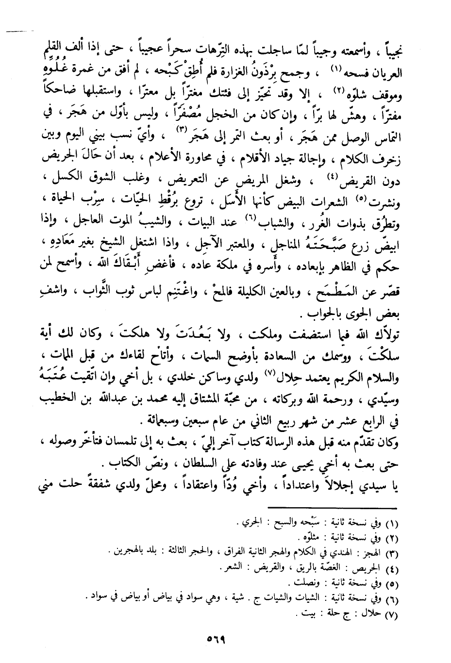 تولّاك الله فيما استضفت وملكت، ولا بعدت ولا هلكت، وكان لك أية سلكت، ووسمك من السعادة بأوضح السمات، وأتاح لقاءك من قبل الممات، والسلام الكريم يعتمد حلال [7] ولدي وساكن خلدي، بل أخي وإن اتّقيت عتبة وسيّدي، ورحمة الله وبركاته، من محبّة المشتاق إليه محمد بن عبد الله بن الخطيب في الرابع عشر من شهر ربيع الثاني من عام سبعين وسبعمائة.