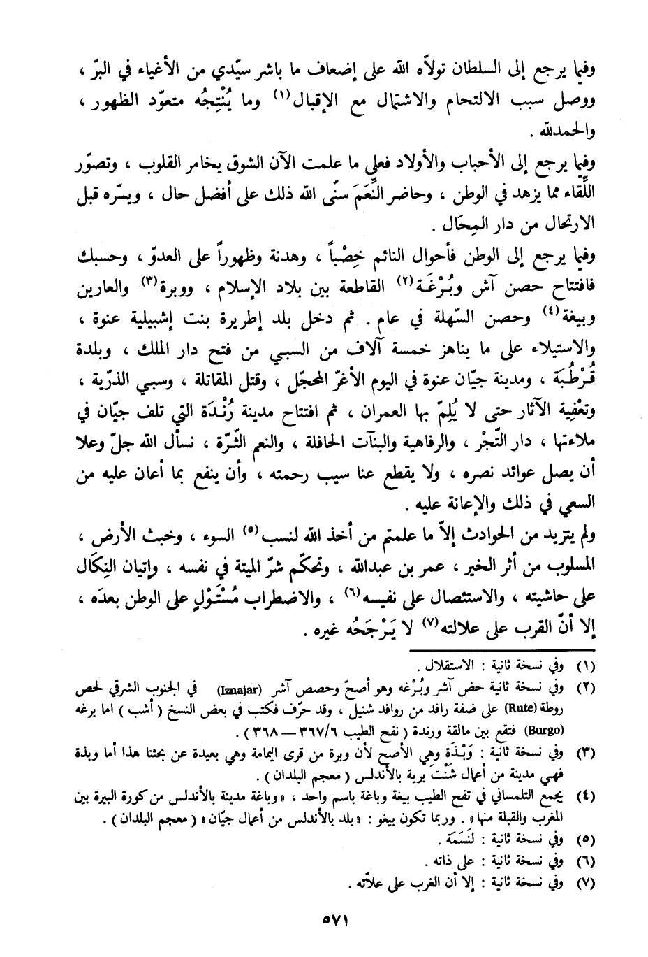 وفيما يرجع إلى الوطن فأحوال النائم خصبا، وهدنة وظهورا على العدوّ، وحسبك فافتتاح حصن آش وبرغة [2] القاطعة بين بلاد الإسلام، ووبرة [3] والعارين وبيعة [4] وحصن السّهلة في عام. ثم دخل بلد إطريرة بنت إشبيلية عنوة، والاستيلاء على ما يناهز خمسة آلاف من السبي من فتح دار الملك، وبلدة قرطبة، ومدينة جيّان عنوة في اليوم الأغرّ المحجّل، وقتل المقاتلة، وسبي الذرّية، وتعفية الآثار حتى لا يلمّ بها العمران، ثم افتتاح مدينة رندة التي تلف جيّان في ملاءتها، دار التّجر، والرفاهيّة والبنات الحافلة، والنعم الثّرّة، نسأل الله جلّ وعلا أن يصل عوائد نصره، ولا يقطع عنا سيب رحمته، وأن ينفع بما أعان عليه من السعي في ذلك والإعانة عليه.