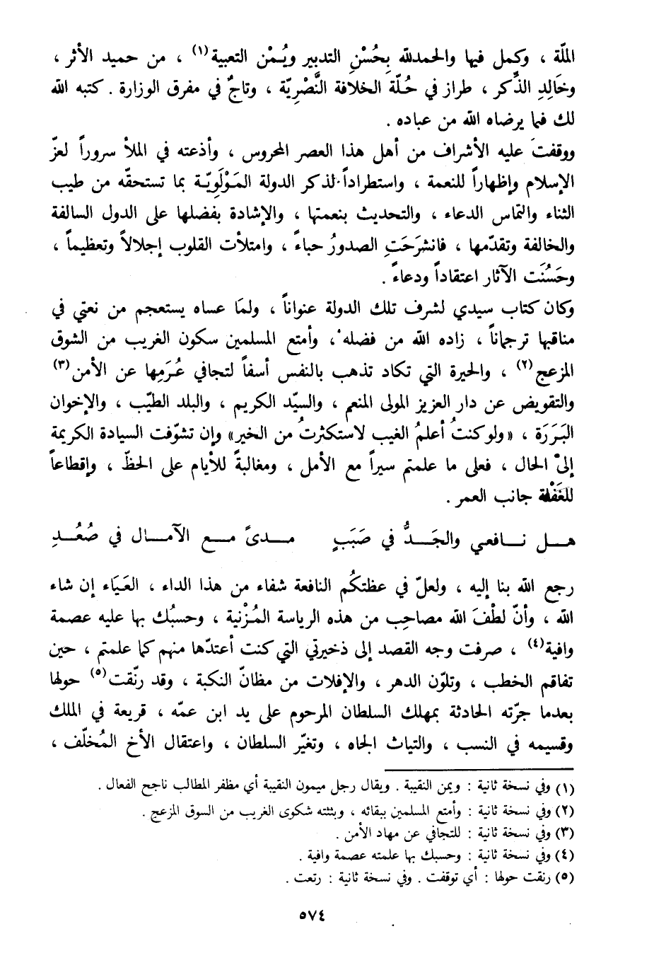 ووقفت عليه الأشراف من أهل هذا العصر المحروس، وأذعته في الملأ سرورا لعزّ الإسلام وإظهارا للنعمة، واستطرادا لذكر الدولة المولويّة بما تستحقّه من طيب الثناء والتماس الدعاء، والتحديث بنعمتها، والإشادة بفضلها على الدول السالفة والخالفة وتقدّمها، فانشرحت الصدور حباء، وامتلأت القلوب إجلالا وتعظيما، وحسنت الآثار اعتقادا ودعاء.
