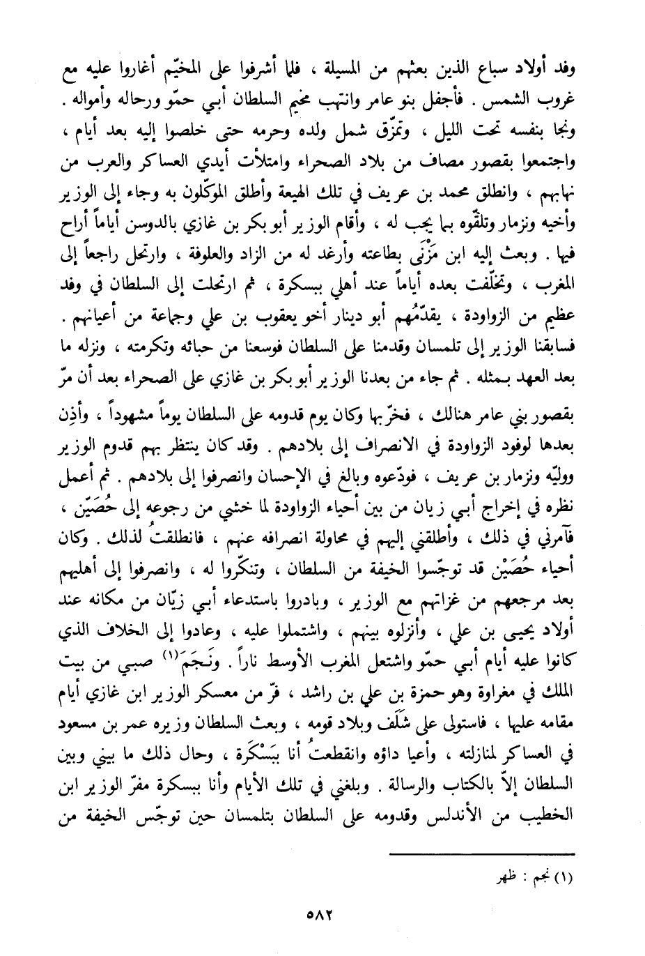 فسابقنا الوزير إلى تلمسان وقدمنا على السلطان فوسعنا من حبائه وتكرمته، ونزله ما بعد العهد بمثله. ثم جاء من بعدنا الوزير أبو بكر بن غازي على الصحراء بعد أن مرّ بقصور بني عامر هنالك، فخرّبها وكان يوم قدومه على السلطان يوما مشهودا، وأذن بعدها لوفود الزواودة في الانصراف إلى بلادهم. وقد كان ينتظر بهم قدوم الوزير ووليّه ونزمار بن عريف، فودّعوه وبالغ في الإحسان وانصرفوا إلى بلادهم. ثم أعمل نظره في إخراج أبي زيان من بين أحياء الزواودة لما خشي من رجوعه إلى حصين، فآمرني في ذلك، وأطلقني إليهم في محاولة انصرافه عنهم، فانطلقت لذلك. وكان أحياء حصين قد توجّسوا الخيفة من السلطان، وتنكّروا له، وانصرفوا إلى أهليهم بعد مرجعهم من غزاتهم مع الوزير، وبادروا باستدعاء أبي زيّان من مكانه عند أولاد يحيى بن علي، وأنزلوه بينهم، واشتملوا عليه، وعادوا إلى الخلاف الّذي كانوا عليه أيام أبي حمّو واشتعل المغرب الأوسط نارا. ونجم [1] صبي من بيت الملك في مغراوة وهو حمزة بن علي بن راشد، فرّ من معسكر الوزير ابن غازي أيام مقامه عليها، فاستولى على شلف وبلاد قومه، وبعث السلطان وزيره عمر بن مسعود في العساكر لمنازلته، وأعيا داؤه وانقطعت أنا ببسكرة، وحال ذلك ما بيني وبين السلطان إلّا بالكتاب والرسالة. وبلغني في تلك الأيام وأنا ببسكرة مفرّ الوزير ابن الخطيب من الأندلس وقدومه على السلطان بتلمسان حين توجّس الخيفة من