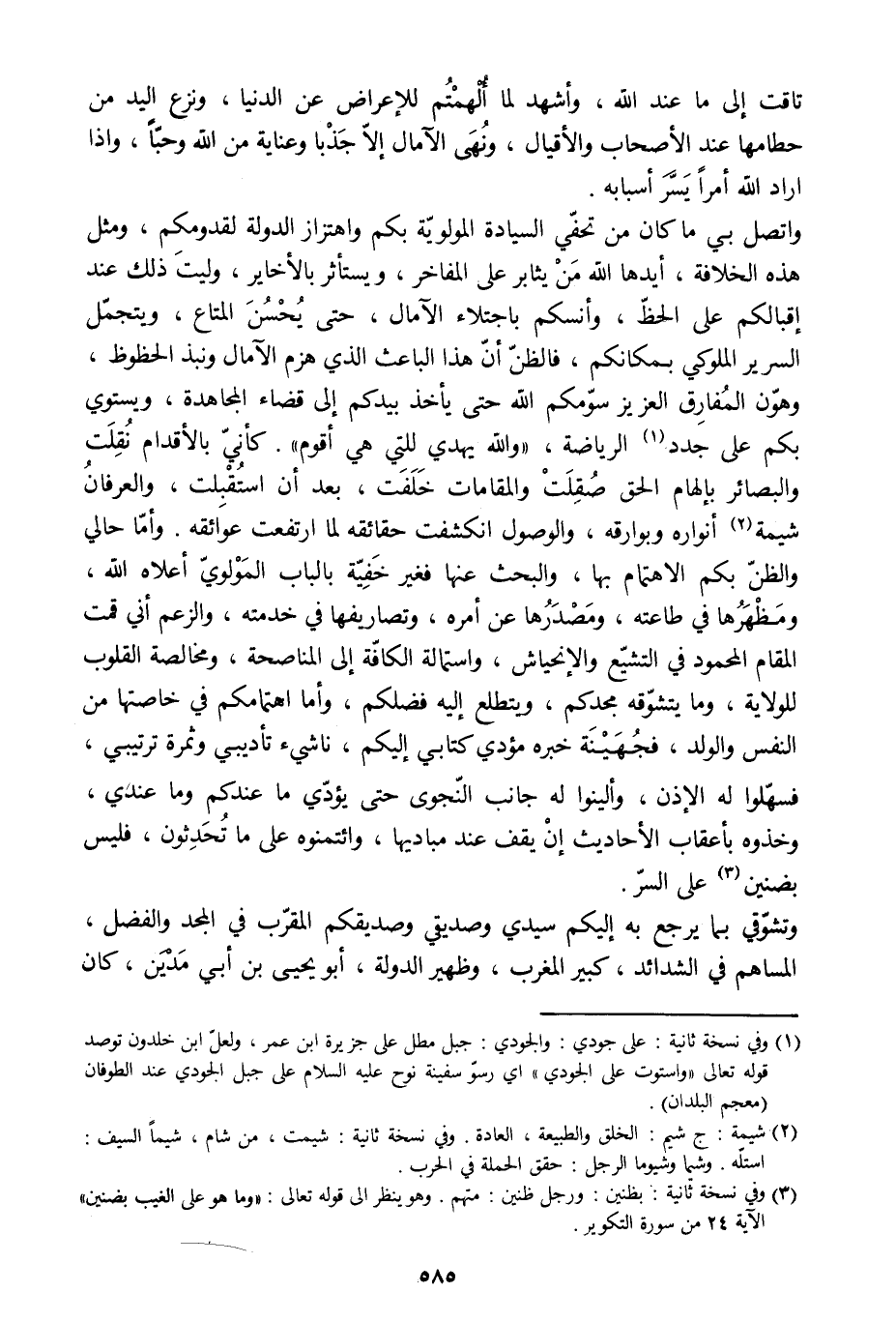 واتصل بي ما كان من تحفّي السيادة المولويّة بكم واهتزاز الدولة لقدومكم، ومثل هذه الخلافة، أيدها الله من يثابر على المفاخر، ويستأثر بالأخاير، وليت ذلك عند إقبالكم على الحظّ، وأنسكم باجتلاء الآمال، حتى يحسن المتاع، ويتجمّل السرير الملوكي بمكانكم، فالظنّ أنّ هذا الباعث الّذي هزم الآمال ونبذ الحظوظ، وهوّن المفارق العزيز سوّمكم الله حتى يأخذ بيدكم إلى قضاء المجاهدة، ويستوي بكم على جدد [1] الرياضة، «والله يهدي للتي هي أقوم» . كأنّي بالأقدام نقلت والبصائر بإلهام الحق صقلت والمقامات خلفت، بعد أن استقبلت، والعرفان شيمة [2] أنواره وبوارقه، والوصول انكشفت حقائقه لما ارتفعت عوائقه. وأمّا حالي والظنّ بكم الاهتمام بها، والبحث عنها فغير خفيّة بالباب المولويّ أعلاه الله، ومظهرها في طاعته، ومصدرها عن أمره، وتصاريفها في خدمته، والزعم أني قمت المقام المحمود في التشيّع والانحياش، واستمالة الكافّة إلى المناصحة، ومخالصة القلوب للولاية، وما يتشوّقه مجدكم، ويتطلع إليه فضلكم، وأما اهتمامكم في خاصتها من النفس والولد، فجهينة خبره مؤدي كتابي إليكم، ناشئ تأديبي وثمرة ترتيبي، فسهّلوا له الإذن، وألينوا له جانب النّجوى حتى يؤدّي ما عندكم وما عندي، وخذوه بأعقاب الأحاديث إن يقف عند مباديها، وائتمنوه على ما تحدثون، فليس بضنين [3] على السرّ.