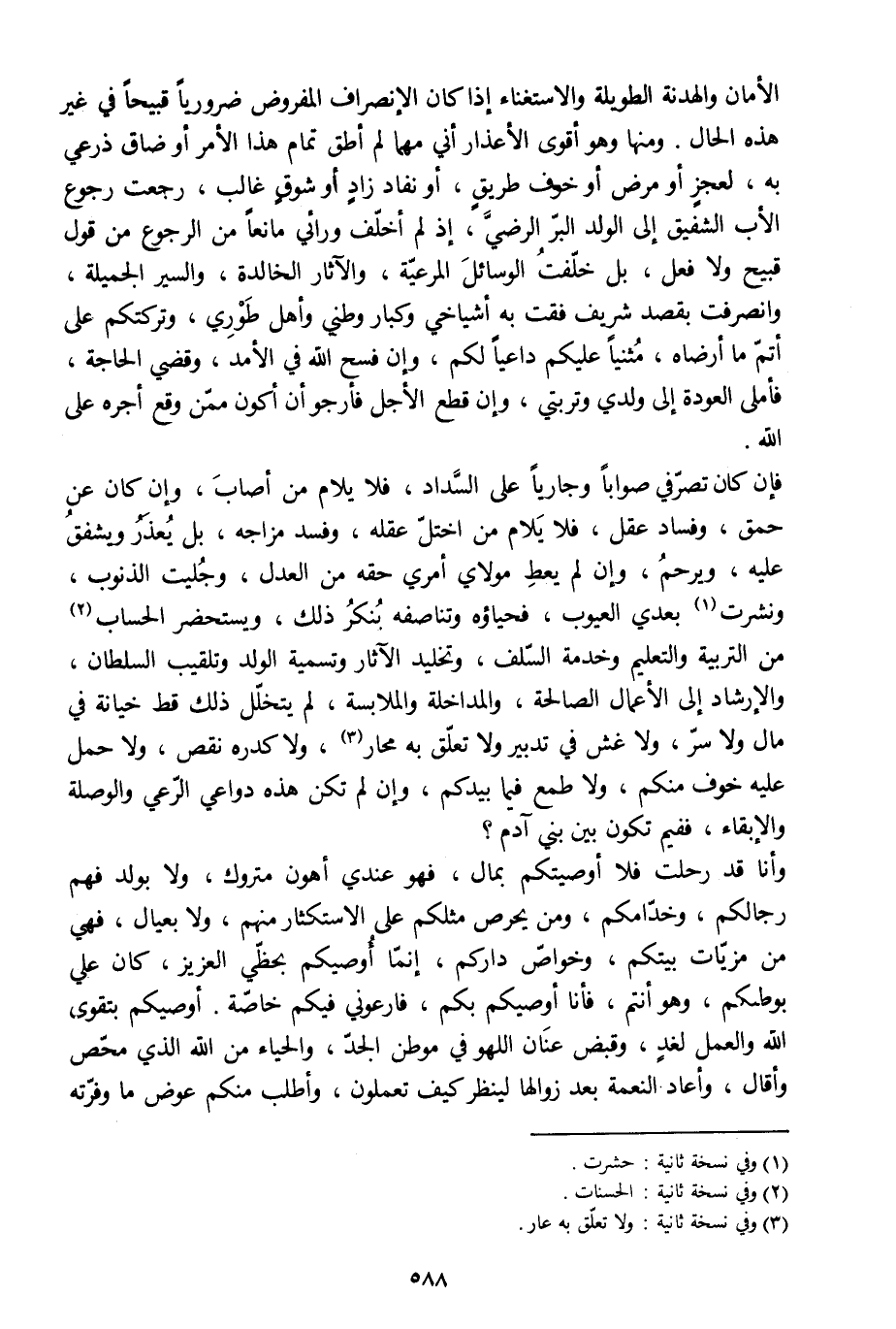الأمان والهدنة الطويلة والاستغناء إذا كان الانصراف المفروض ضروريا قبيحا في غير هذه الحال. ومنها وهو أقوى الأعذار أني مهما لم أطق تمام هذا الأمر أو ضاق ذرعي به، لعجز أو مرض أو خوف طريق، أو نفاد زاد أو شوق غالب، رجعت رجوع الأب الشفيق إلى الولد البرّ الرضيّ، إذ لم أخلّف ورائي مانعا من الرجوع من قول قبيح ولا فعل، بل خلّفت الوسائل المرعيّة، والآثار الخالدة، والسير الجميلة، وانصرفت بقصد شريف فقت به أشياخي وكبار وطني وأهل طوري، وتركتكم على أتمّ ما أرضاه، مثنيا عليكم داعيا لكم، وإن فسح الله في الأمد، وقضي الحاجة، فأملى العودة إلى ولدي وتربتي، وإن قطع الأجل فأرجو أن أكون ممّن وقع أجره على الله.