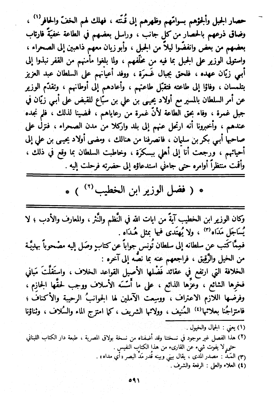 وكان الوزير ابن الخطيب آية من آيات الله في النّظم والنّثر، والمعارف والأدب، لا يساجل مداه [3] ، ولا يهتدى فيها بمثل هداه.