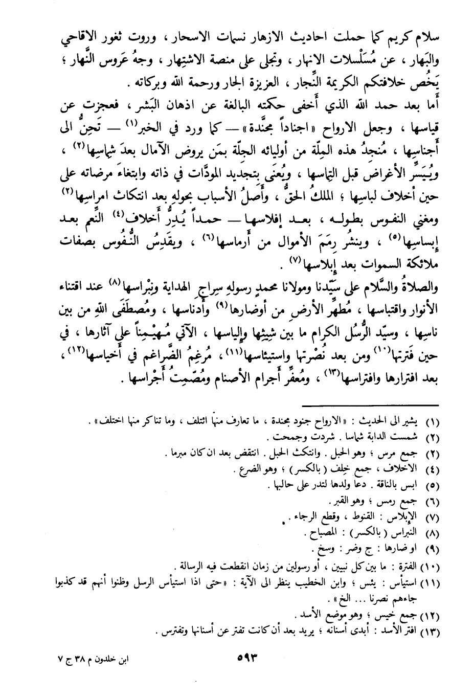 والصلاة والسّلام على سيّدنا ومولانا محمد رسوله سراج الهداية ونبراسها [8] عند اقتناء الأنوار واقتباسها، مطهّر الأرض من أوضارها [9] وأدناسها، ومصطفى الله من بين ناسها، وسيّد الرّسل الكرام ما بين شيثها وإلياسها، الآتي مهيمنا على آثارها، في حين فترتها [10] ومن بعد نصرتها واستيئاسها [11] ، مرغم الضّراغم في أخياسها [12] ، بعد افترارها وافتراسها [13] ، ومعفّر أجرام الأصنام ومصّمت أجراسها.