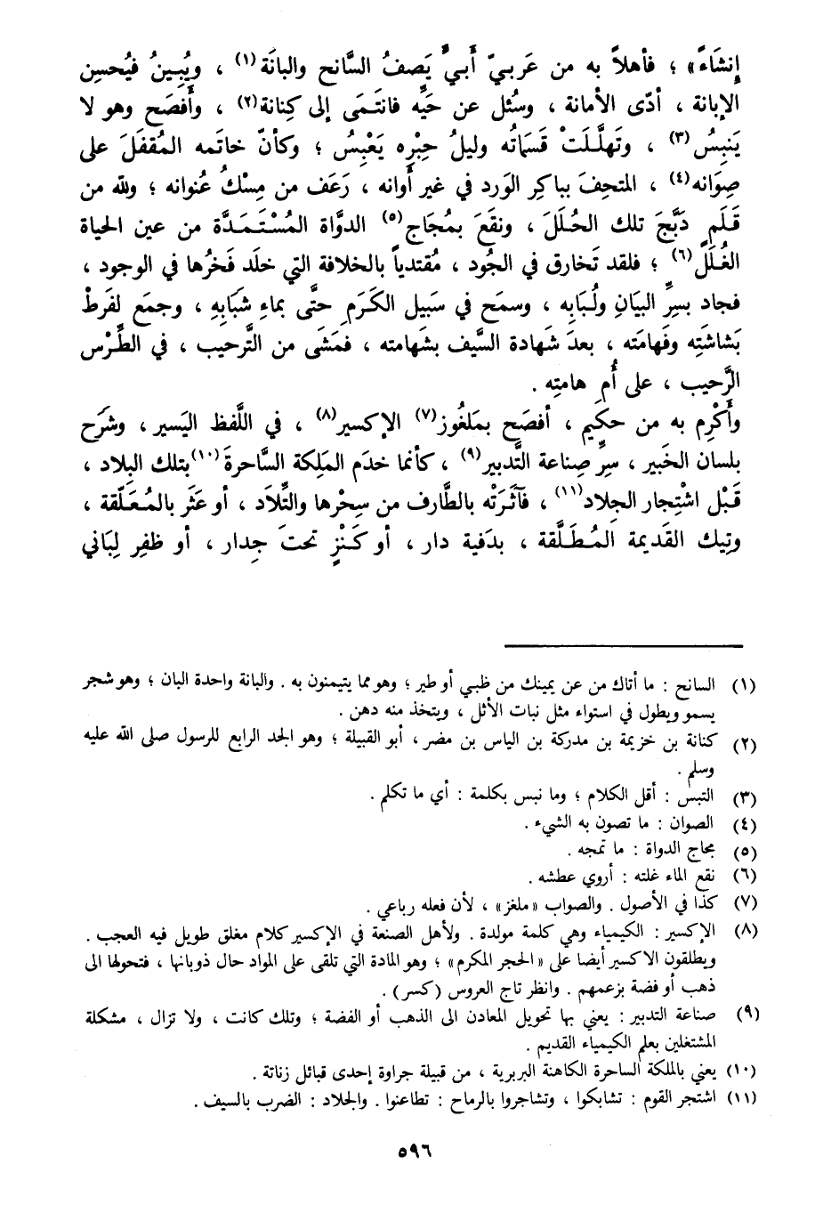 [8] الإكسير: الكيمياء وهي كلمة مولدة. ولأهل الصنعة في الإكسير كلام مغلق طويل فيه العجب.