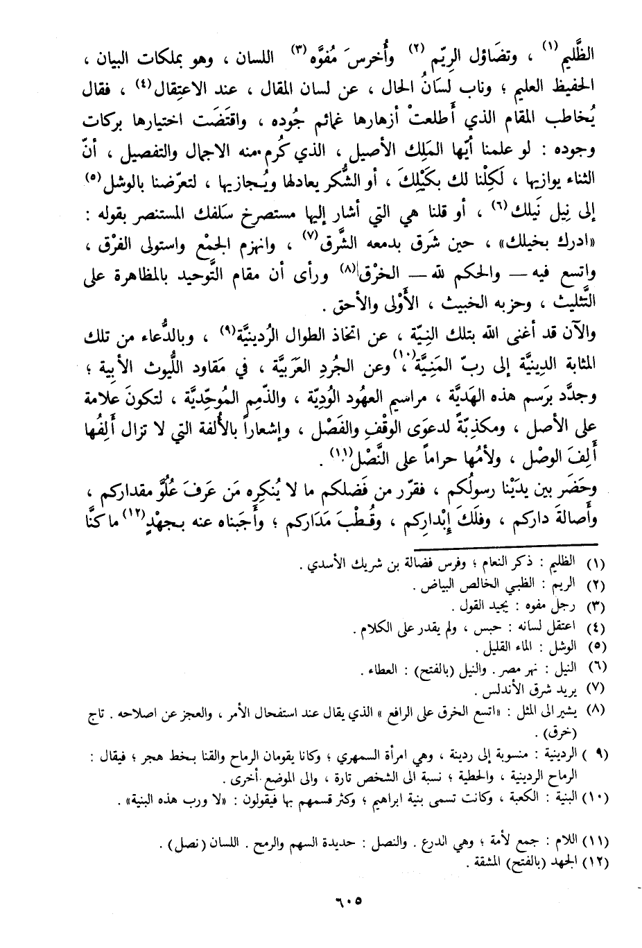 والآن قد أغنى الله بتلك النيّة، عن اتخاذ الطوال الردينيّة [9] ، وبالدّعاء من تلك المثابة الدينيّة إلى ربّ المنيّة [10] ، وعن الجرد العربيّة، في مقاود اللّيوث الأبية، وجدّد برسم هذه الهديّة، مراسيم العهود الوديّة، والذّمم الموحّديّة، لتكون علامة على الأصل، ومكذّبة لدعوى الوقف والفصل، وإشعارا بالألفة التي لا تزال ألفها ألف الوصل، ولأمها حراما على النّصل [11] .