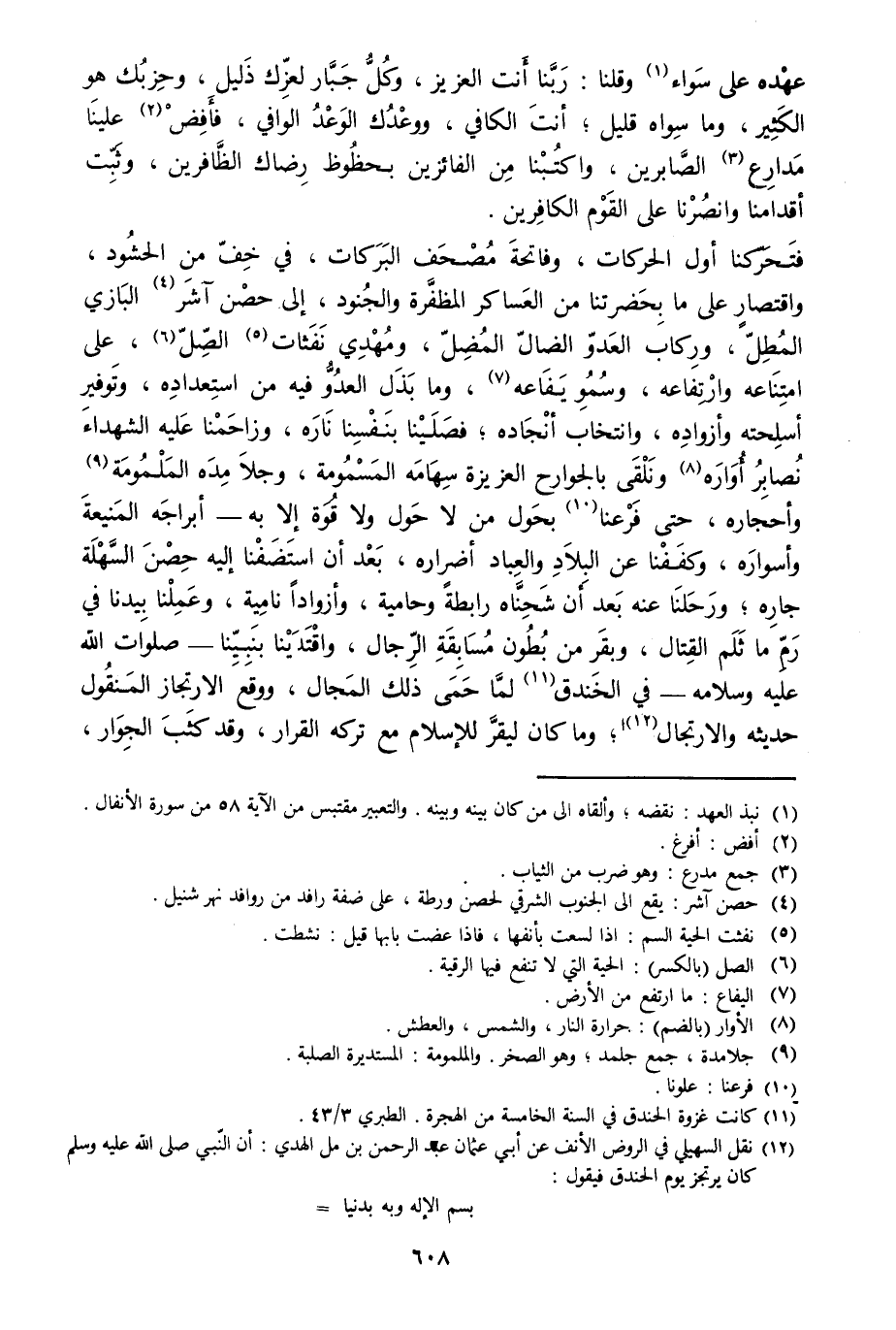 فتحرّكنا أول الحركات، وفاتحة مصحف البركات، في خفّ من الحشود، واقتصار على ما بحضرتنا من العساكر المظفّرة والجنود، إلى حصن آشر [4] البازي المطلّ، وركاب العدوّ الضالّ المضلّ، ومهدي نفثات [5] الصّلّ [6] ، على امتناعه وارتفاعه، وسمو يفاعه [7] ، وما بذل العدوّ فيه من استعداده، وتوفير أسلحته وأزواده، وانتخاب أنجاده، فصلينا بنفسنا ناره، وزاحمنا عليه الشهداء نصابر أواره [8] ونلقى بالجوارح العزيزة سهامه المسمومة، وجلا مده الملمومة [9] وأحجاره، حتى فرعنا [10] بحول من لا حول ولا قوة إلا به- أبراجه المنيعة وأسواره، وكففنا عن البلاد والعباد أضراره، بعد أن استضفنا إليه حصن السّهلة جاره، ورحلنا عنه بعد أن شحنّاه رابطة وحامية، وأزوادا نامية، وعملنا بيدنا في رمّ ما ثلم القتال، وبقر من بطون مسابقة الرّجال، واقتدينا بنبيّنا- صلوات الله عليه وسلامه- في الخندق [11] لمّا حمى ذلك المجال، ووقع الارتجاز المنقول حديثه والارتجال [12] ، وما كان ليقرّ للإسلام مع تركه القرار، وقد كثب الجوار،