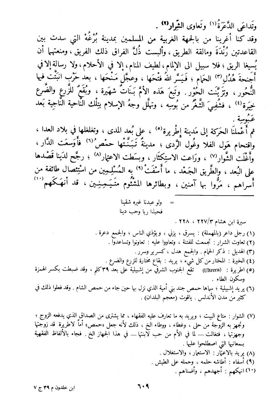 ثم أعملنا الحركة إلى مدينة إطريرة [5] ، على بعد المدى، وتغلغلها في بلاد العدا، واقتحام هول الفلا وغول الرّدى، مدينة تبنّتها حمص [6] فأوسعت الدّار، وأغلت الشّوار [7] ، وراعت الاستكثار، وبسطت الاعتمار [8] ، رجّح لدينا قصدها على البعد، والطّريق الجعد، ما أسفت [9] به المسلمين من استئصال طائفة من أسراهم، مرّوا بها آمنين، وبطائرها المشئوم متيمنين، قد أنهكهم [10]