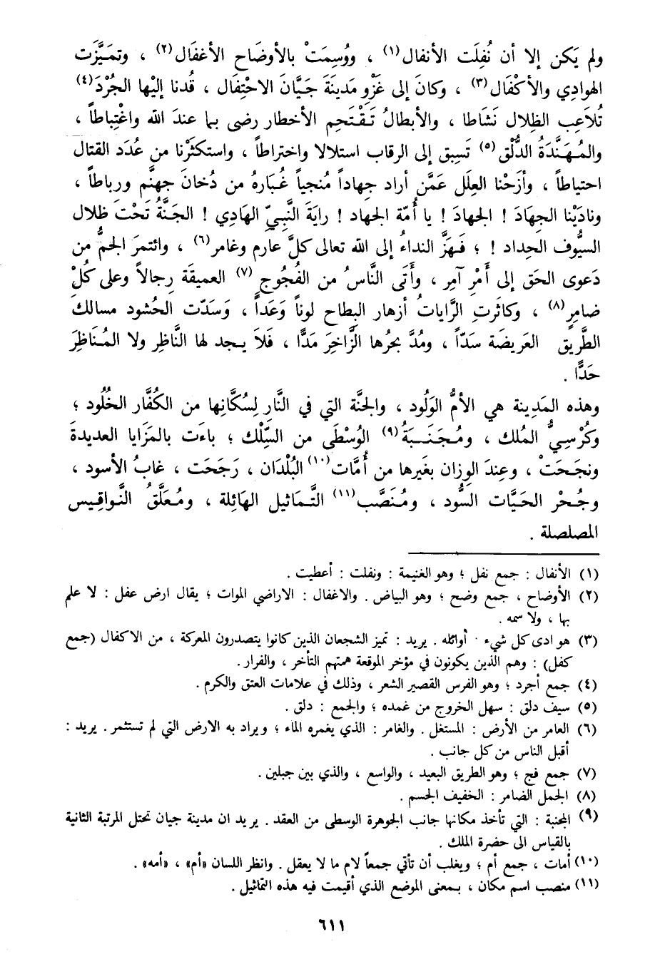 ولم يكن إلا أن نفلت الأنفال [1] ، ووسمت بالأوضاح الأغفال [2] ، وتميّزت الهوادي والأكفال [3] ، وكان إلى غزو مدينة جيّان الاحتفال، قدنا إليها الجرد [4] تلاعب الظلال نشاطا، والأبطال تقتحم الأخطار رضى بما عند الله واغتباطا، والمهنّدة الدّلق [5] تسبق إلى الرقاب استلالا واختراطا، واستكثرنا من عدد القتال احتياطا، وأزحنا العلل عمّن أراد جهادا منجيا غباره من دخان جهنّم ورباطا، ونادينا الجهاد! الجهاد! يا أمّة الجهاد! راية النّبيّ الهادي! الجنّة تحت ظلال السّيوف الحداد!، فهزّ النداء إلى الله تعالى كلّ عارم وغامر [6] ، وائتمر الجمّ من دعوى الحق إلى أمر آمر، وأتى النّاس من الفجوج [7] العميقة رجالا وعلى كل ضامر [8] ، وكاثرت الرّايات أزهار البطاح لونا وعدا، وسدّت الحشود مسالك الطّريق العريضة سدّا، ومدّ بحرها الزّاخر مدّا، فلا يجد لها النّاظر ولا المناظر حدّا.