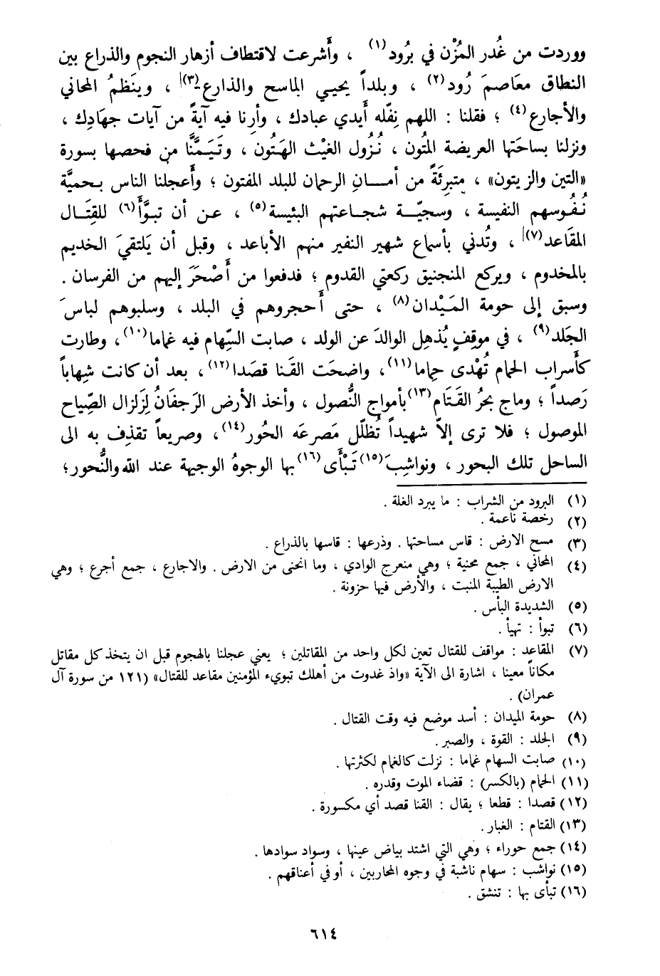 وسبق إلى حومة الميدان [8] ، حتى أحجروهم في البلد، وسلبوهم لباس الجلد [9] ، في موقف يذهل الوالد عن الولد، صابت السّهام فيه غماما [10] ، وطارت كأسراب الحمام تهدى حماما [11] ، وأضحت القنا قصدا [12] ، بعد أن كانت شهابا رصدا، وماج بحر القتام [13] بأمواج النّصول، وأخذ الأرض الرجفان لزلزال الصّياح الموصول، فلا ترى إلّا شهيدا تظلّل مصرعه الحور [14] ، وصريعا تقذف به الى الساحل تلك البحور، ونواشب [15] تبأى [16] بها الوجوه الوجيهة عند الله والنّحور،