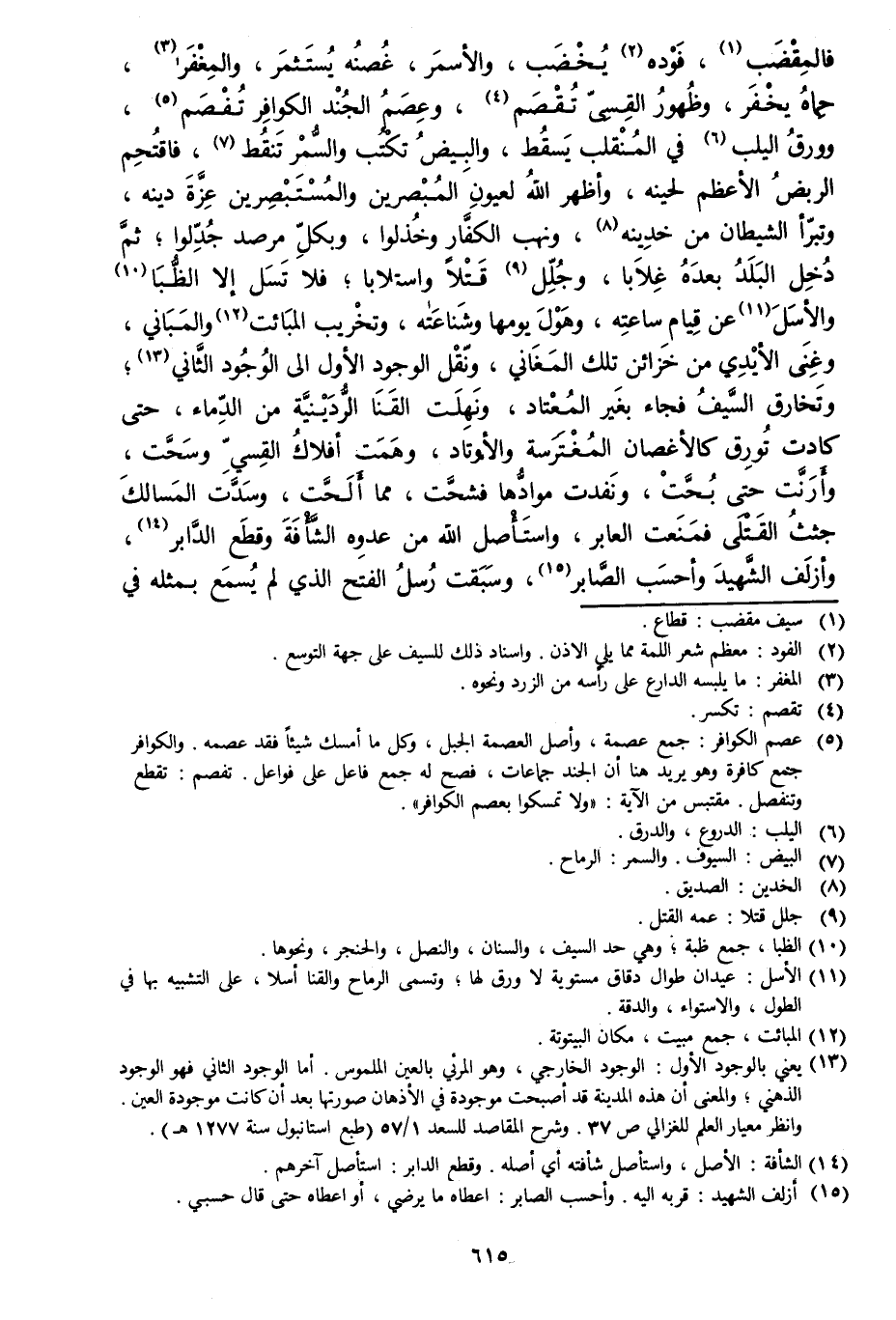 فالمقضب [1] ، فوده [2] يخضب، والأسمر، غصنه يستثمر، والمغفر [3] ، حماه يخفر، وظهور القسيّ تقصم [4] ، وعصم الجند الكوافر تفصم [5] ، وورق اليلب [6] في المنقلب يسقط، والبيض تكتب والسّمر تنقط [7] ، فاقتحم الربض الأعظم لحينه، وأظهر الله لعيون المبصرين والمستبصرين عزّة دينه، وتبرّأ الشيطان من خدينه [8] ، ونهب الكفّار وخذلوا، وبكلّ مرصد جدّلوا، ثمّ دخل البلد بعده غلابا، وجلّل [9] قتلا واستلابا، فلا تسل إلا الظّبا [10] والأسل [11] عن قيام ساعته، وهول يومها وشناعته، وتخريب المبائت [12] والمباني، وغنى الأيدي من خزائن تلك المغاني، ونقل الوجود الأول الى الوجود الثّاني [13] ، وتخارق السّيف فجاء بغير المعتاد، ونهلت القنا الرّدينيّة من الدّماء، حتى كادت تورق كالأغصان المغترسة والأوتاد، وهمت أفلاك القسيّ وسحّت، وأرنّت حتى بحّت، ونفدت موادّها فشحّت، مما ألحّت، وسدّت المسالك جثث القتلى فمنعت العابر، واستأصل الله من عدوه الشّأفة وقطع الدّابر [14] ، وأزلف الشّهيد وأحسب الصّابر [15] ، وسبقت رسل الفتح الّذي لم يسمع بمثله في