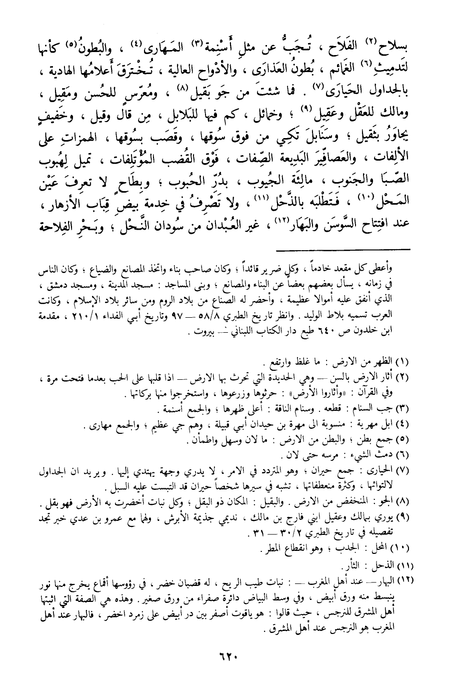 حيث الظّهور [1] المثارة بسلاح [2] الفلاح، تجبّ عن مثل أسنمة [3] المهارى [4] ، والبطون [5] كأنها لتدميث [6] الغمائم، بطون العذارى، والأدواح العالية، تخترق أعلامها الهادية، بالجداول الحيارى [7] . فما شئت من جو بقيل [8] ، ومعرّس للحسن ومقيل، وما لك للعقل وعقيل [9] ، وخمائل، كم فيها للبلابل، من قال وقيل، وخفيف يجاور بثقيل، وسنابل تكي من فوق سوقها، وقصب بسوقها، الهمزات على الألفات، والعصافير البديعة الصّفات، فوق القضب المؤتلفات، تميل لهبوب الصّبا والجنوب، مالئة الجيوب، بدرّ الحبوب، وبطاح لا تعرف عين المحل [10] ، فتطلبه بالذّحل [11] ، ولا تصرف في خدمة بيض قباب الأزهار، عند افتتاح السّوسن والبهار [12] ، غير العبدان من سودان النّحل، وبحر الفلاحة