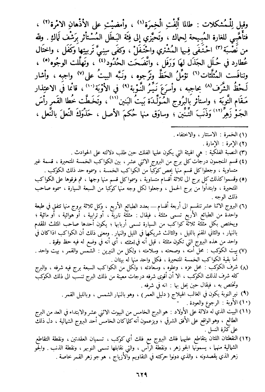 [3] النصبة الفلكية: هي الهيئة التي يكون عليها الفلك حين طلب دلالته على الحوادث.
