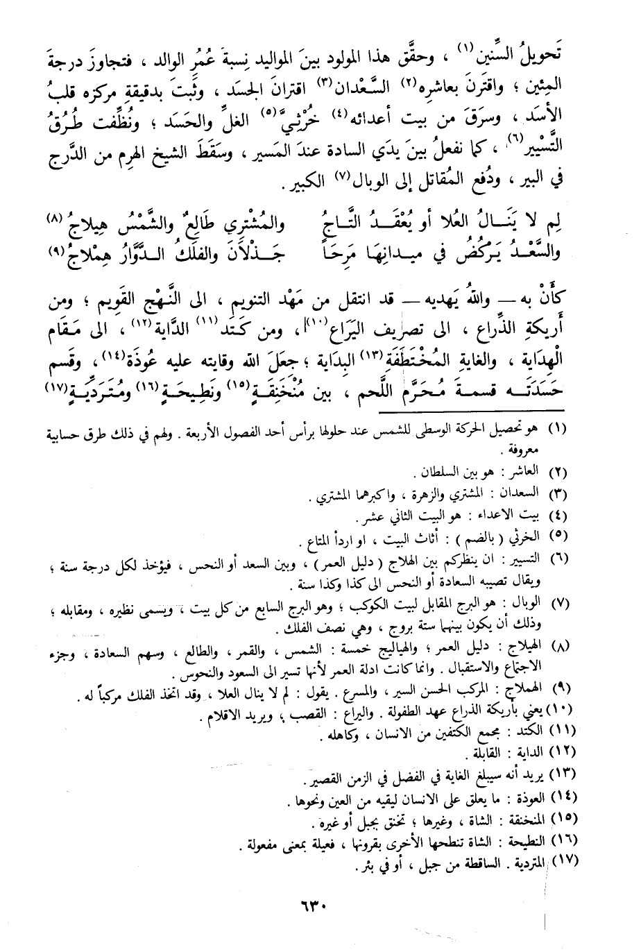 [6] التسيير: ان ينظركم بين الهلاج (دليل العمر) ، وبين السعد أو النحس، فيؤخذ لكل درجة سنة، ويقال تصيبه السعادة أو النحس الى كذا وكذا سنة.